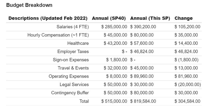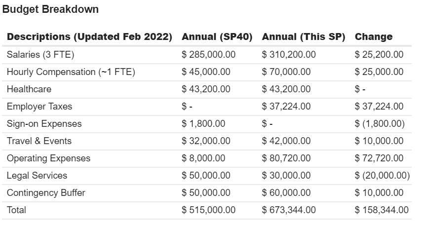 - Some housekeeping fixes to include a budget for employer taxes and our legal spend.