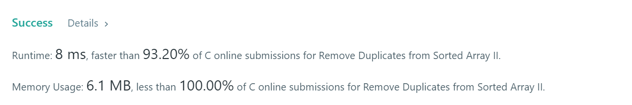 因為題目已經給定是排序過後的陣列,所以從Array的Index 0開始往後檢查,每次檢查是否為已出現過的數字,若不是則將該數字放置欲放置的index(該變數為expect),若為已出現過的數字,則再檢查是否只出現兩次以下(該變數為count),若是才將該變數放置欲放置的index。