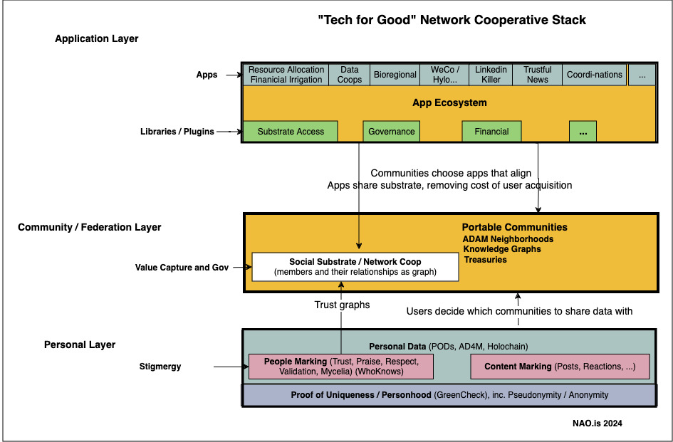 ## Networked Adaptive Organisms (NAO) ### An immune response to the metacrisis #### The Problem Humanity has reached a state that any unchecked dominant species likely would reach on any planet with life. Our 'selfish gene' has gotten so good at controlling everything to its benefit that we've overshot the planetary boundaries of the very resources and systems that all of nature, including us, depends on. Beyond that, we've invented [technologies that can destroy us](https://www.nature.com/articles/d41586-024-00147-z) even before we exhaust the planet, without the knowledge or wisdom necessary to control or even understand them. In a nutshell, we're in the midst of a [metacrisis](https://ernesto-87727.medium.com/the-metacrisis-how-to-navigate-our-epochs-greatest-challenge-b127a4f23a00). It's not a problem we can fix; it's an era. But how we navigate it is up to us. How can humanity thread a path through to the best possible future? #### What hope? We've long known that climate, biodiversity loss, water, soil, and many other crises were looming, but it's now [one minute to midnight](https://en.wikipedia.org/wiki/Doomsday_Clock). What hope do we have of changing fast enough to avoid the worst case outcomes? What hope do we have of realizing the best possible futures, a '[world that works for all](https://www.bfi.org/about-fuller/big-ideas/world-game/)'? Our only hope is to *rise above our current planetary operating systems* (nation states, oligarchy, nature as a commodity, zero-sum games) to dramatically new forms of multiscale coordination that allow us to address global problems cooperatively. Is that possible? We believe it is, not to 'solve' the metacrisis, but to outcompete the current systems, and emergently coordinate at scale to minimize damage and shift to regenerating the planet instead of exploiting it. #### But how? Short answer: *networked adaptive organisms; a large global citizenry, manifested as digital networks of trust and respect, good at prosocial superorganism behavior*. > “The only organization capable of unprejudiced growth, or unguided learning, is a network. All other topologies limit what can happen.” - Kevin Kelly Think neurons and synapses, mycelial networks, etc. There are 100s of Ms of people who do believe that a world that works for all is possible. Yet that cohort has little real agency to affect the changes needed, because it's diffuse and marginalized. The solution is to manifest that constituency as global networks of trust and respect, propagating by invitation from key leadership, aka *kernels*. And to exploit the powerful innate capacity for emergent coordination, sensemaking, and action that only networks possess. Kernels set the initial conditions, the intent, principles, goals of a network, and the invitation requirement ensures a high *density of trust and respect* and *coherence of intent* as it grows. Networks that align can easily aggregate and federate (e.g. climate, social justice, indigenous, decentralized web, ...) The world is waiting for a credible approach to pulling together cooperatively. This approach can work now. #### Strategy The core opportunity is to rapidly span a large and growing segment of humanity, through such trust networks, that embodies a worldview with wide appeal, and has the agency to begin to realize it and a growing suite of new coordination capabilities. We can grow such networks now, and create the new coordination tools that use them as they grow, spirally. Our working title is ***WhoKnows***, and it is effectively a decentralized, cooperatively owned analog to Respect Networks / Connect.me from 14+ years ago. Those two qualifiers make it immune to attack by LinkedIn or other corporate entities. The following approach makes sense in terms of spiralling constituencies: * the Tech for Good community * comfortable with new tech, able to innovate on it * e.g. [Internet Identity Workshop](https://internetidentityworkshop.com/), [DWeb](https://getdweb.net/), [Metagov](https://metagov.org/) * 1000s * the [Regenerative movement](https://thinkregeneration.com/regeneration-q%26a) and [Climate Majority](https://climatemajorityproject.com/) * Millions of regen practitioners worldwide * Agroforestry, regen ag, biodiversity conservation, oceans... * Bioregional constituencies * Dozens of climate orgs with hundreds of local hubs * 100s of 1000s or Ms * The global left in general * 100s of Ms support environmentalism, social justice, economic equity, cooperation vs. competition... * The persuadable middle * A large portion of humanity has no concept that a regenerative planet is possible * And are mainly focused on themselves and their families * But would greatly benefit from a healthy planet and major shifts to equitable economics * Bs Yes, the same approach can be taken by alternative worldviews, but those would be, what, a world that doesn't work for all? #### Value Proposition and Financial Bootstrapping Besides saving the planet, this approach has serious financial value that can be used as nutrients for rapid innovation. All the constituencies listed above have deep knowledge in their heads of the expertise of others, currently not accessible to software. The invitation mechanism, and further *people curation*, converts that soft knowledge into *edges* in a *social graph* that can hold detailed *respect vectors*. For instance, Chris respects Kelly in the domains of *ocean acidification* and *project management*. The aggregate result is a [social graph](https://en.wikipedia.org/wiki/Social_graph), and we all know that [social graphs have high value](https://www.forbes.com/sites/anthonykosner/2012/05/31/facebook-values-itself-based-on-metcalfes-law-but-the-market-is-using-zipfs/?sh=2f95017168f5). Such a *social substrate* needs to be cooperatively owned, hence a *[network cooperative](https://docs.google.com/presentation/d/16XERa0eLGq2PgwT3xmC8lvYQRxwN2jdMtaLzwmRVQ2E/edit#slide=id.g1a4567fb90a_0_0)*, a new organization