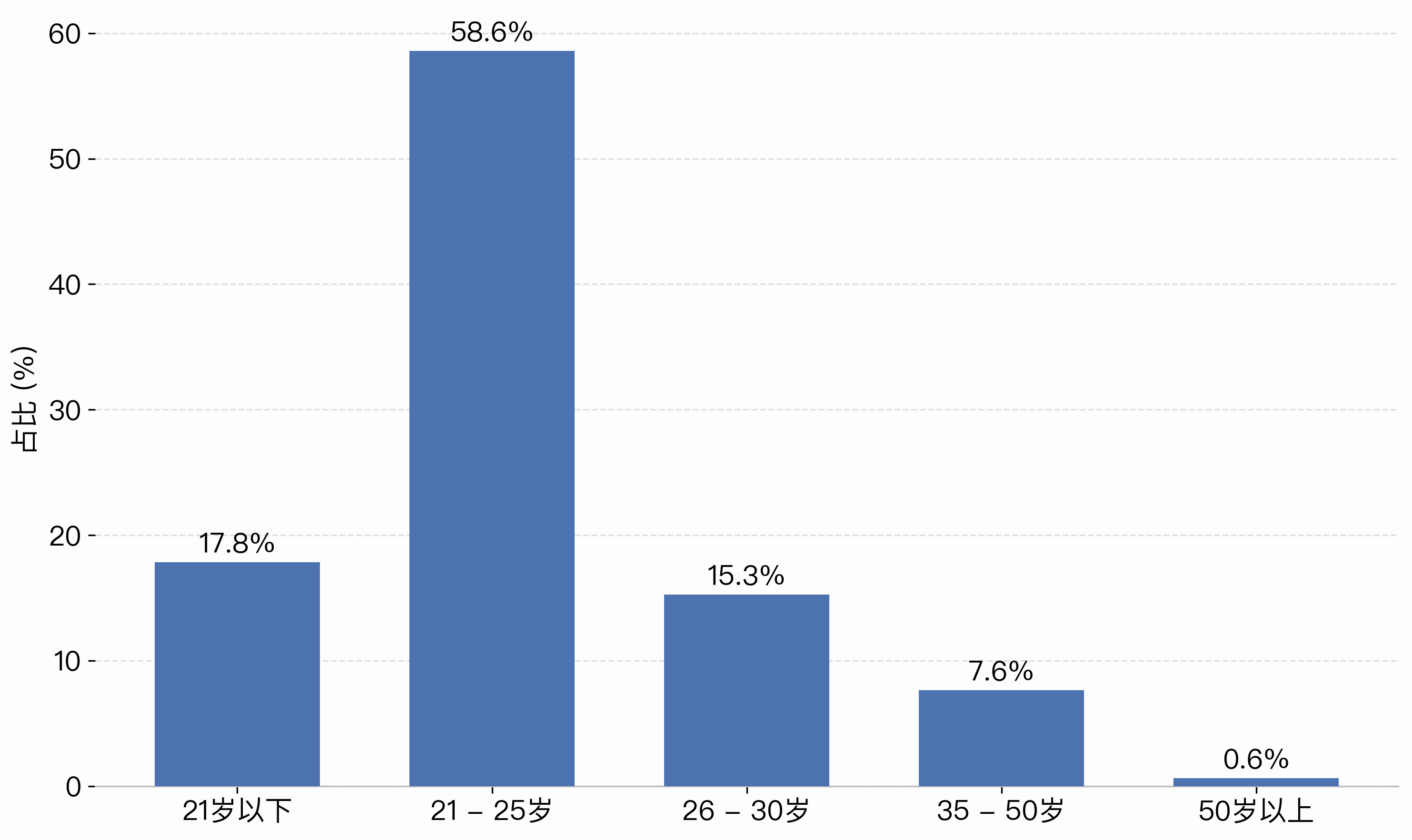 调查数据显示，受访者主要集中在21-30岁这个年龄段，其中21-25岁的受访者占比最高，其次是26-30岁。这表明开源社区的受众群体以年轻人为主，尤其是处于职业早期的成年人，他们可能对新技术和开源项目更感兴趣，更愿意参与和贡献。