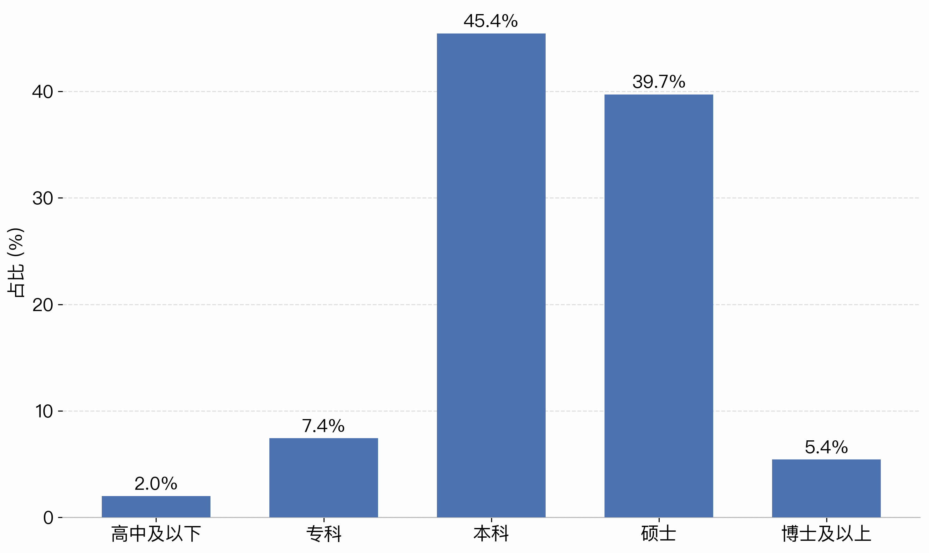 - **教育背景**：受访者的学历层次整体偏高，本科及以上合计占据绝大多数，其中本科略低于一半，硕士接近四成，博士及以上只占很小一部分；专科和高中及以下合计不足一成。这表明本次样本高度集中在具有高校教育背景的技术与研究群体。