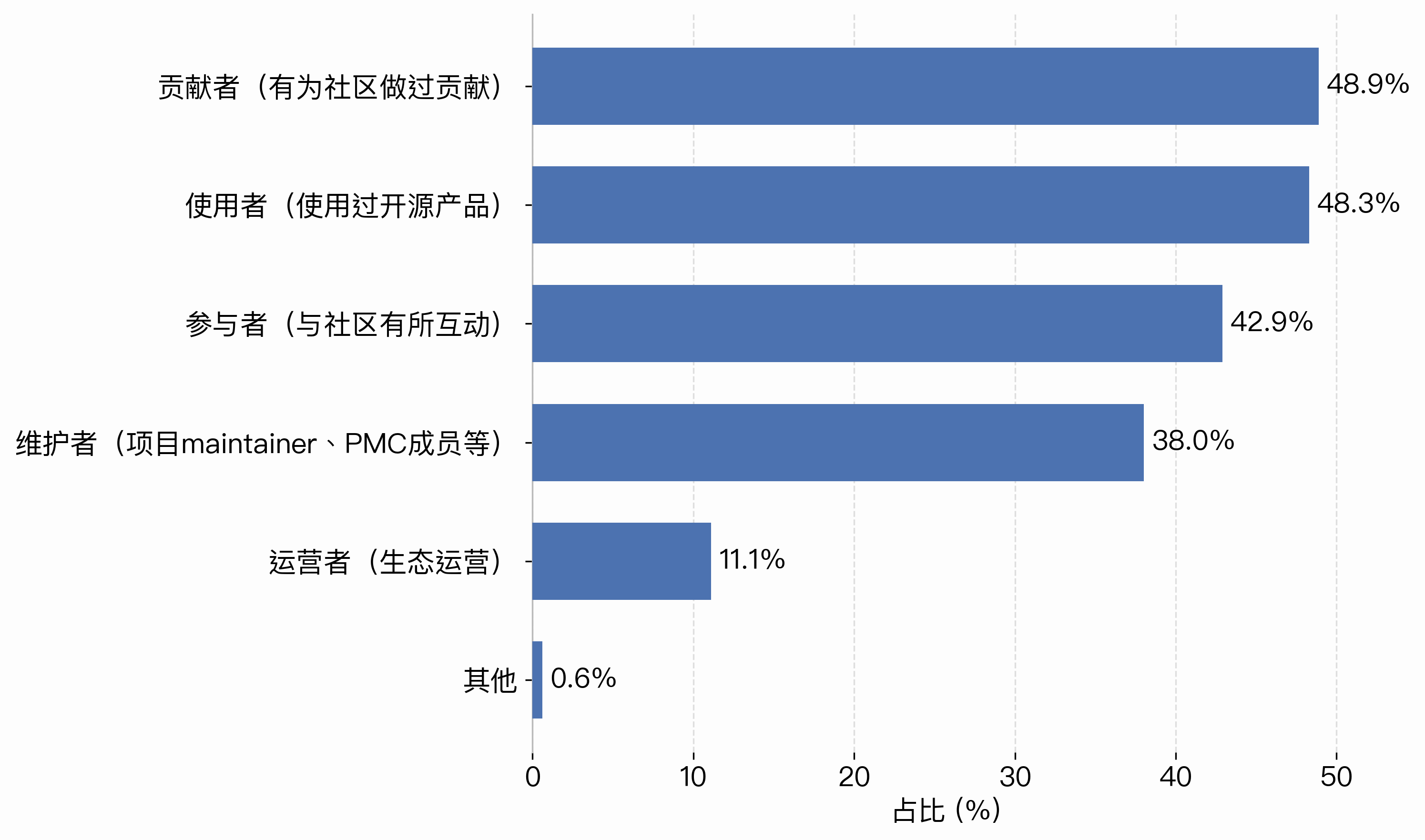 调查显示，开源社区中“使用者”和“贡献者”几乎并列成为最主要的两类角色：有为社区做过贡献的“贡献者”和“仅使用开源产品的使用者”比例都接近一半，且贡献者略高一些，说明相当一部分用户已经从“只使用”升级为“有实际贡献”。此外，“参与者”（与社区有互动行为）和“维护者”（maintainer / PMC 等）也各占了相当比例，“运营者（生态运营）”则占到一成左右，体现出从使用、参与、贡献到维护与运营的多层次角色梯队。