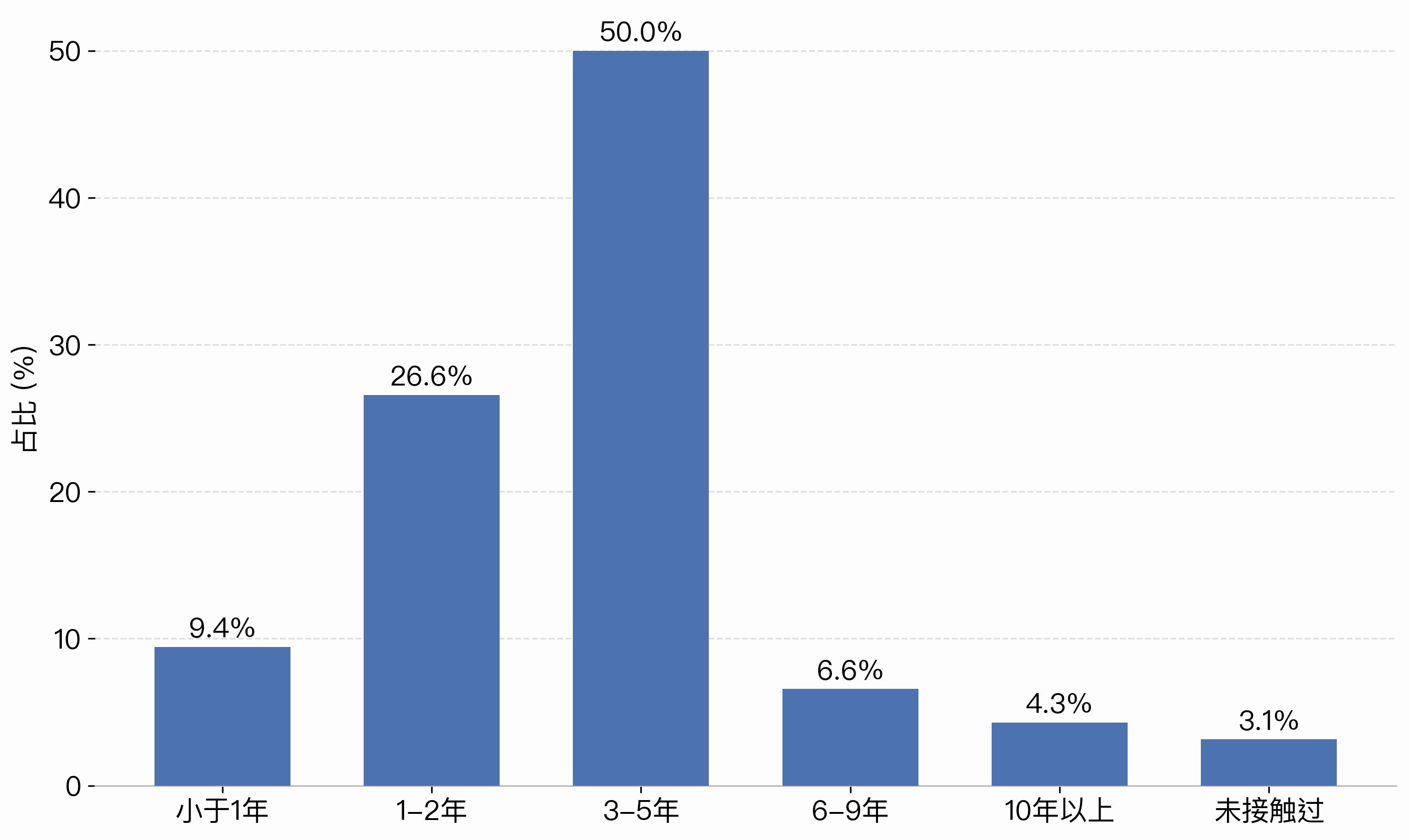 - **开源接触时长**：受访者在开源领域的接触时长从少于1年到10年以上不等，显示出开源社区中新老成员的混合。