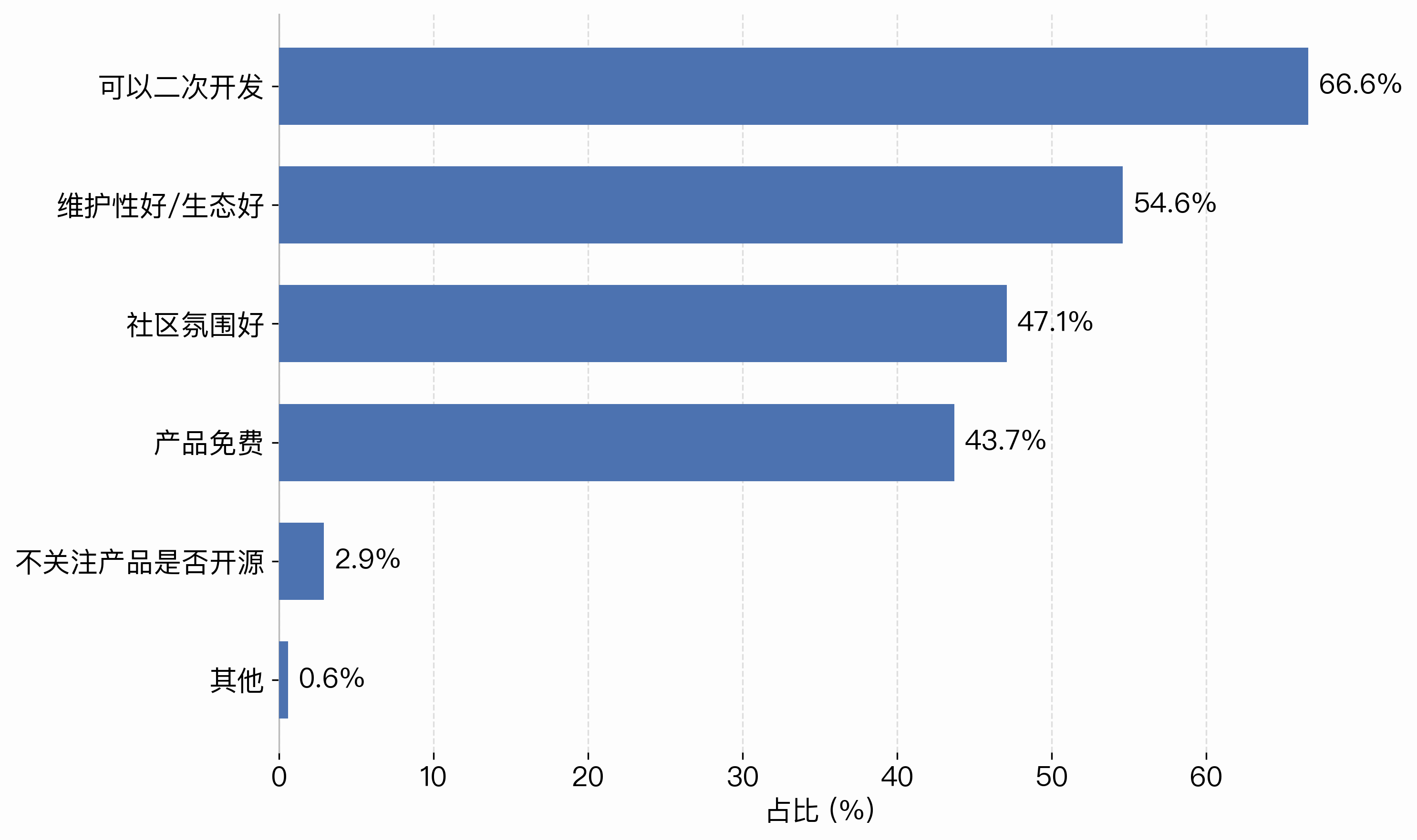 从统计结果来看，“可以二次开发”是最核心的驱动力，约有三分之二的受访者选择这一项；其后依次是“维护性好、生态好”和“社区氛围好”，而“产品免费”虽然仍然重要，但相对前三项略低。这说明在今天的开源使用决策中，可二次开发能力与长期维护生态，比“免费”本身更具吸引力。