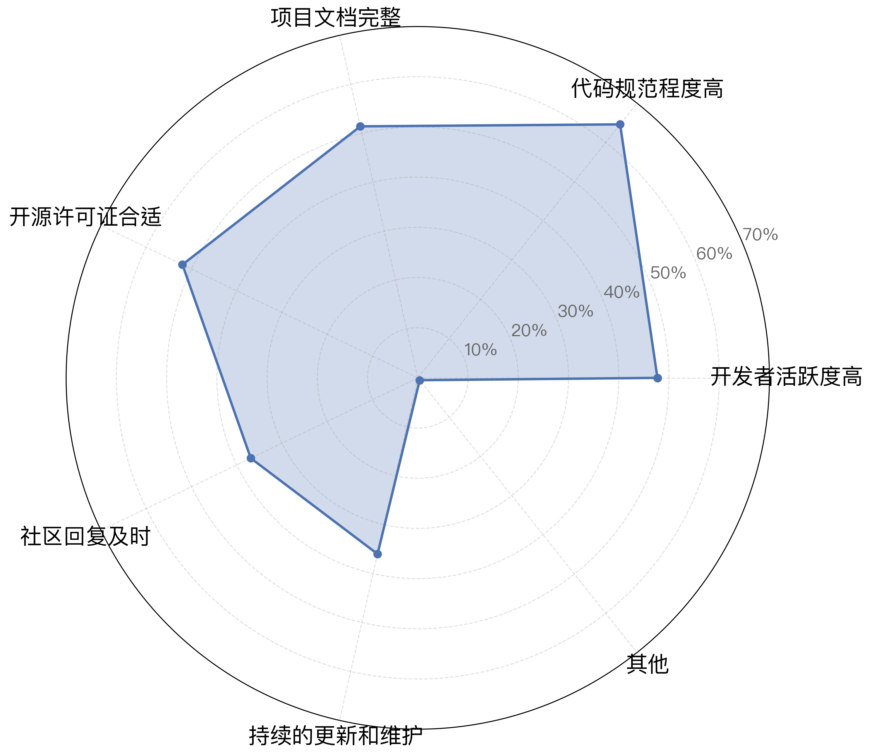 在影响具体项目选择方面，受访者最看重的是“代码规范程度高”，其次是“开源许可证合适”和“项目文档完整”，“开发者活跃度高”紧随其后。可以看到，合规性与可维护性（规范、文档、许可证）与社区活跃度一起，构成了开发者评估开源项目质量的重要参考。