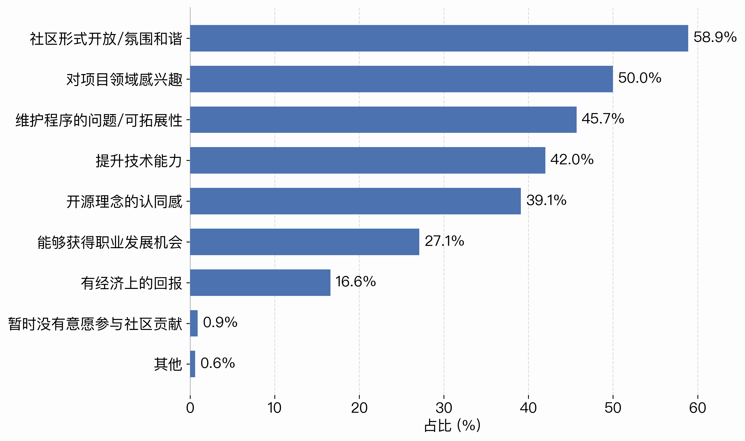 促使开发者对项目做出贡献的因素中，“社区形式开放 / 氛围和谐”位居首位，接近六成受访者勾选；其次是“对项目领域感兴趣”、“维护程序的问题 / 可拓展性”和“提升技术能力”，这三项都在四成以上。相比之下，“开源理念的认同感”“职业发展机会”和“经济回报”的选择比例略低，处于三成到一成多的区间。可以看出，良好的社区氛围与兴趣驱动，叠加技术成长与认同感，是推动贡献的核心驱动力，物质激励则处于相对次要的位置。