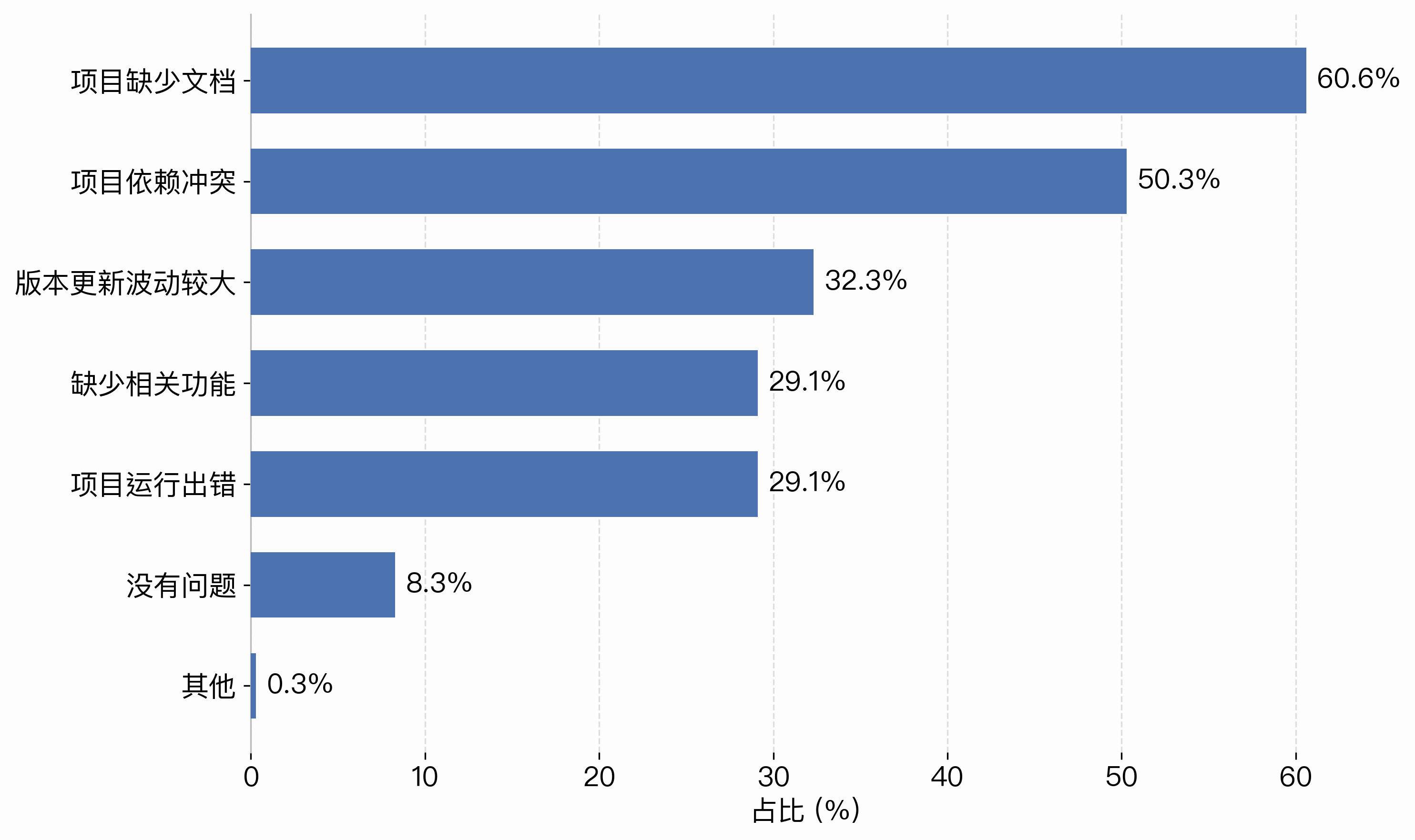 在使用开源产品时，“项目缺少文档”是被提及最多的问题，有超过六成的受访者选择这一项；其次是“项目依赖冲突”，大约有一半受访者遇到过，“版本更新波动较大”则有三成多的受访者提及。同时，“缺少相关功能”和“项目运行出错”的比例也接近三成，而表示“没有问题”的只占极少数，可见文档质量与依赖管理仍是当前开源产品体验中的主要痛点。