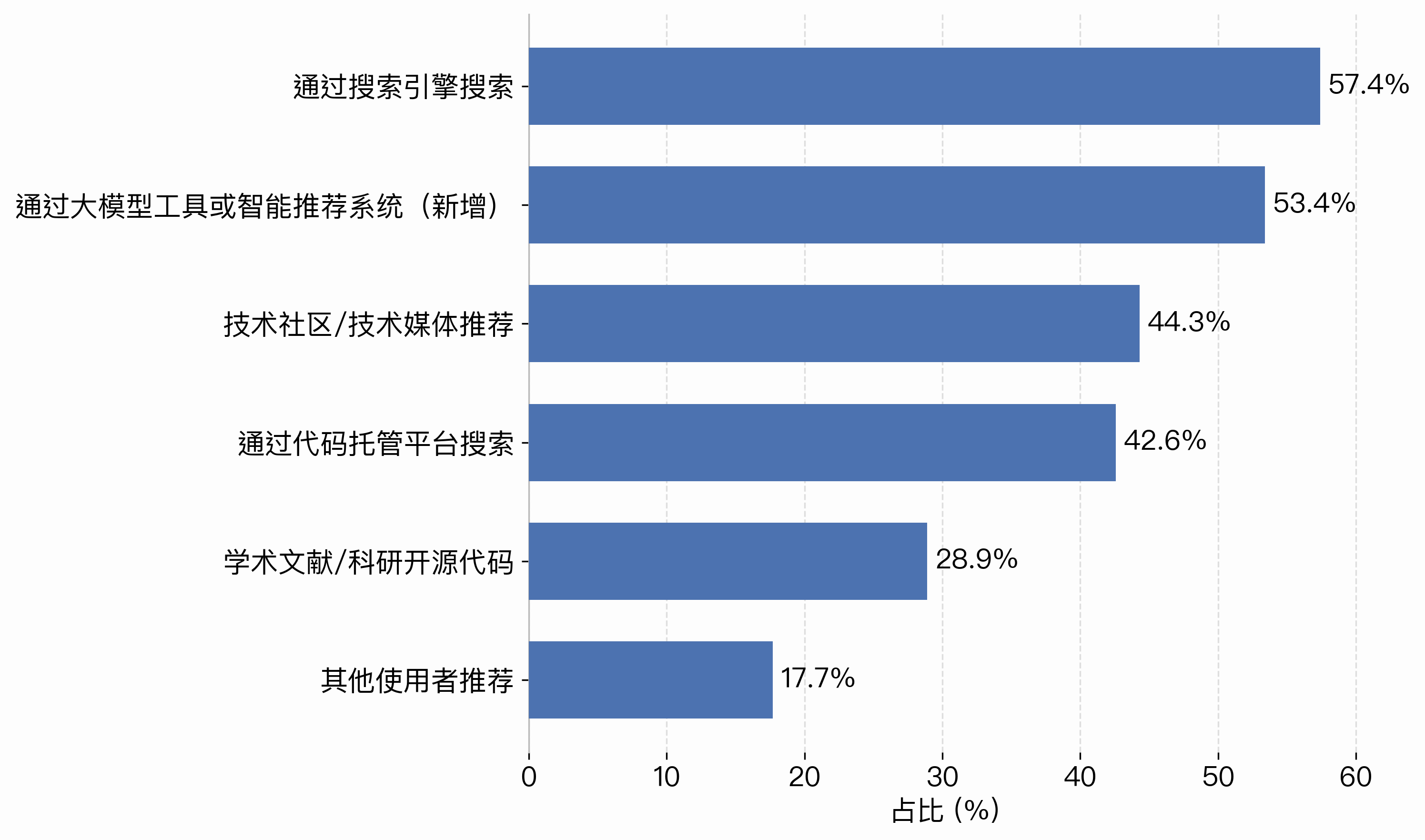 - **开源检索途径**：大多数受访者通过代码托管平台、搜索引擎、技术社区和技术文档来检索开源产品。