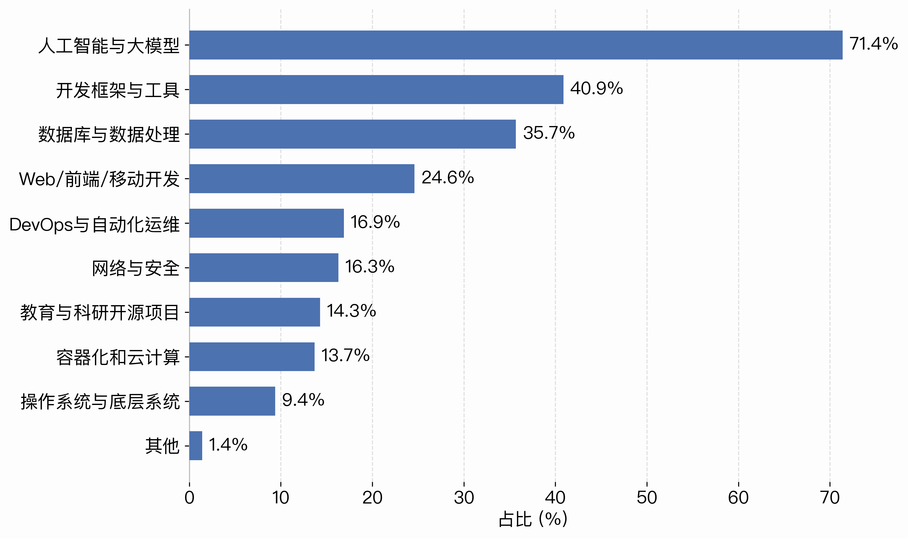 在感兴趣的技术方向上，“人工智能与大模型”以超过七成的选择率压倒性居首，远高于其他选项；其后依次是“开发框架与工具”和“数据库与数据处理”，大致在四成到三成多的区间，Web / 前端 / 移动开发也有接近四分之一的受访者感兴趣。DevOps 与自动化运维、网络与安全、教育与科研项目、容器化与云计算等方向多集中在一至两成之间，操作系统与底层系统则相对小众，表明当前开源技术关注重心明显向 AI 与开发效率工具倾斜。