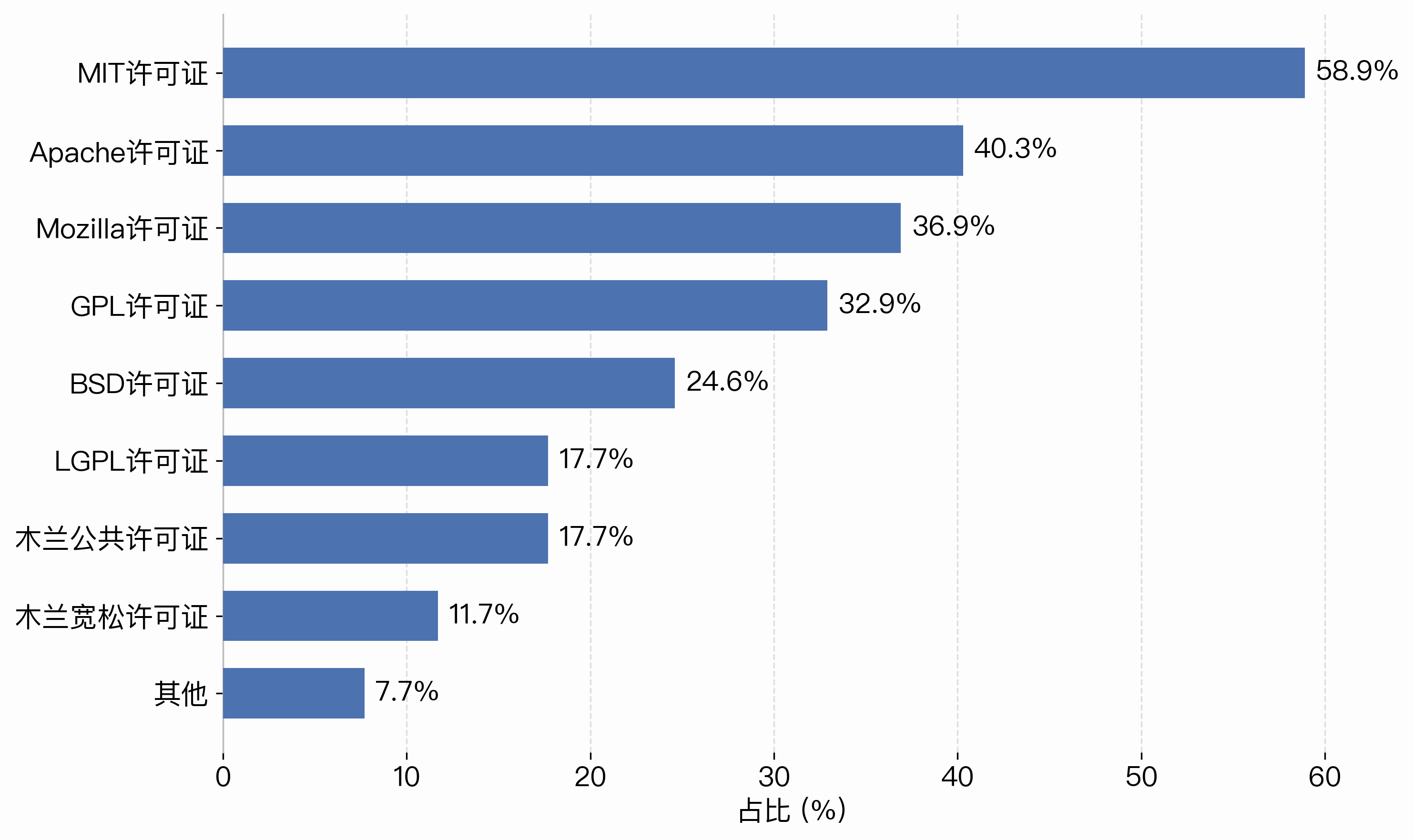 关于开源许可证认知，MIT 许可证是被了解最多的一类，约有六成受访者听说或使用过，其次是 Apache、Mozilla 和 GPL，均有三到四成受访者了解，而 BSD、LGPL 以及木兰系列许可证则构成了第二梯队，多集中在一到两成左右。整体来看，国际主流许可证的认知度仍然最高，但本土木兰许可证也已经在受访者中获得了一定的知名度。