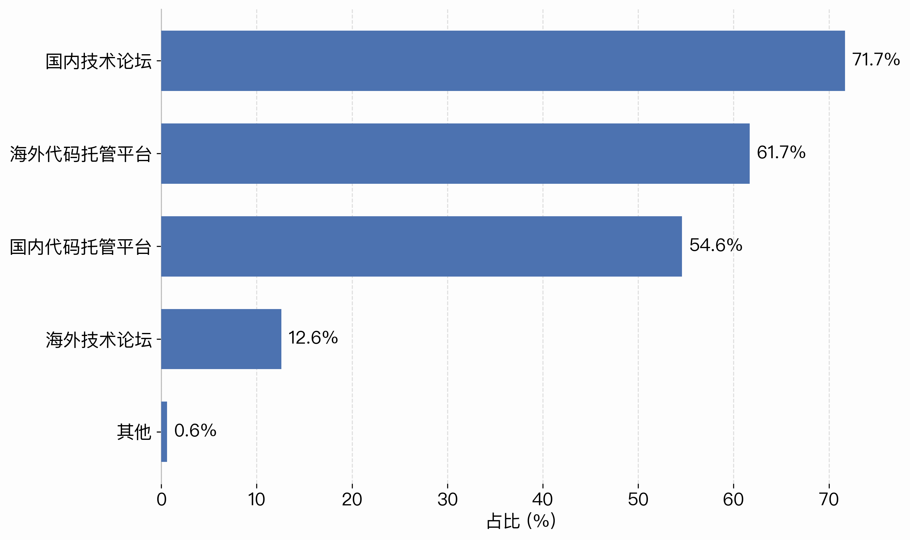 在常用的产品 / 技术社区方面，“国内技术论坛”是使用频率最高的渠道，选择比例超过七成；其次是海外代码托管平台（如 GitHub 等）和国内代码托管平台，大致在六成和一半左右，而海外技术论坛的使用比例相对较低，仅有一小部分人经常访问。这表明开发者一方面依托国内技术社区进行信息交流与内容消费，另一方面又高度依赖国内外代码托管平台进行实际协作与代码管理。