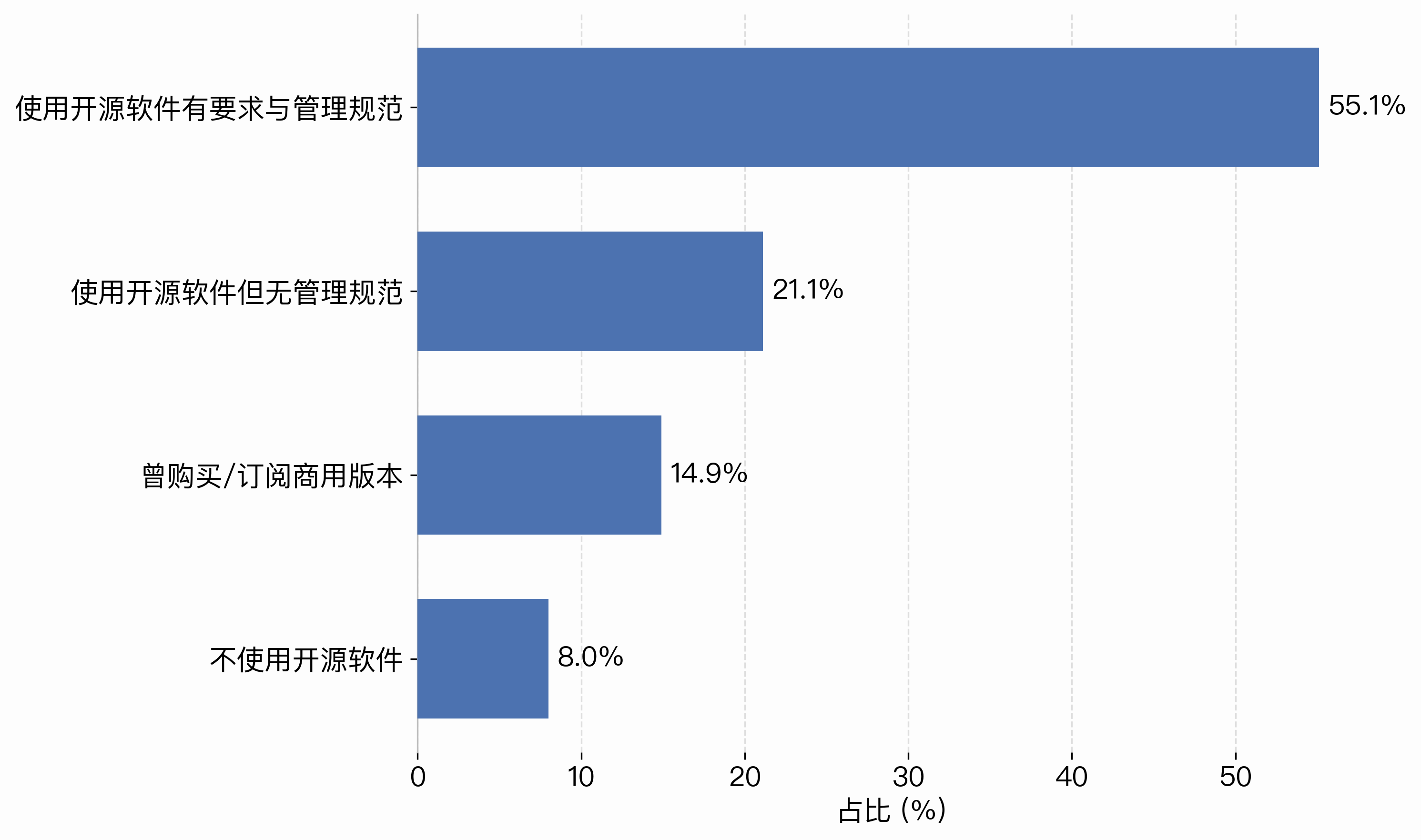 - **企业开源使用情况**：多数企业使用社区版开源软件，并制定相应的使用要求和管理规范。