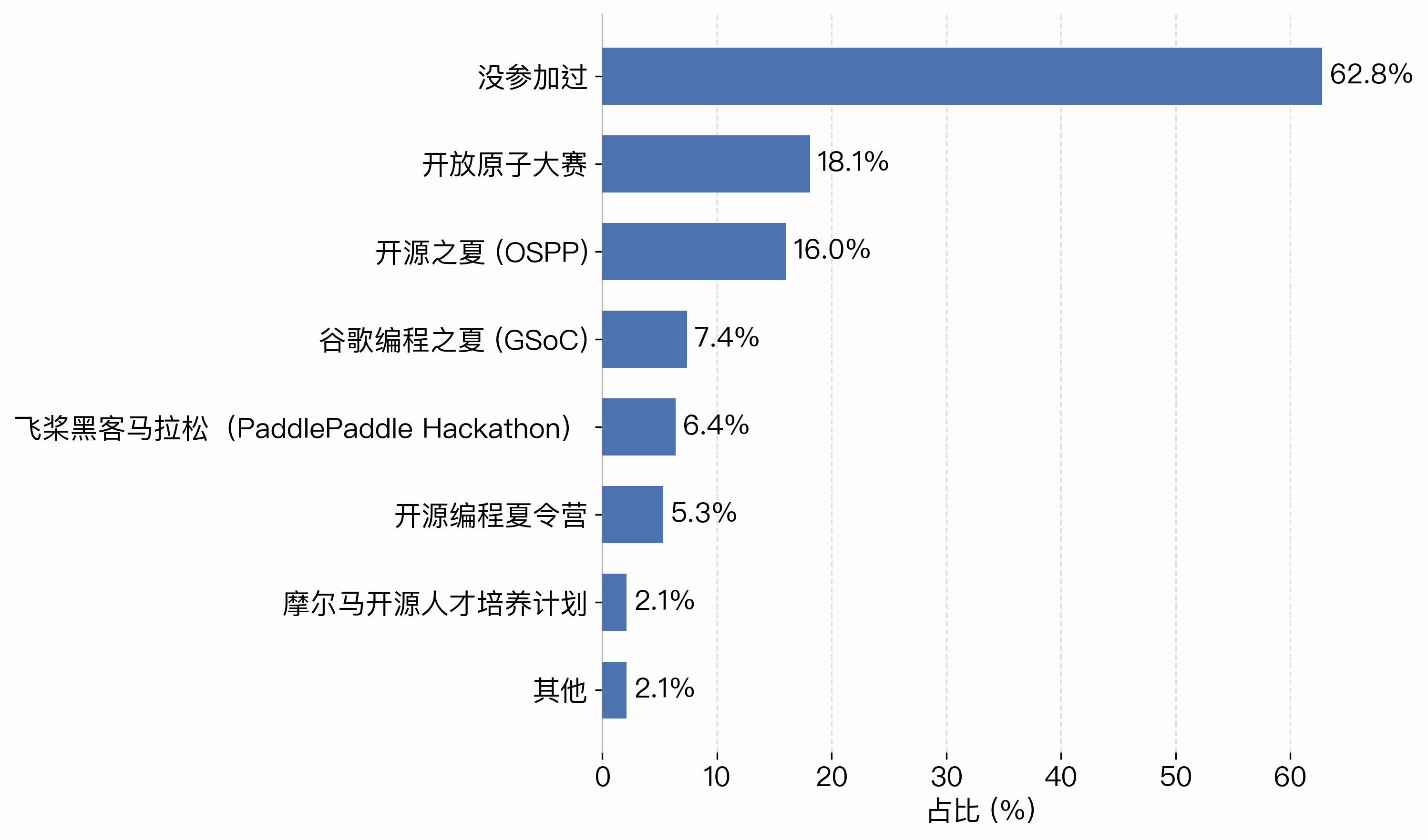 在开源实践活动参与方面，“没参加过相关活动”的受访者占比超过六成，说明高校与社区层面的开源实践活动在可见度与覆盖面上仍有较大提升空间。在已经参与过活动的人群中，开放原子大赛、开源之夏（OSPP）、各类开源编程夏令营以及 GSoC 等国际项目是最主要的参与形式，单项比例多集中在一到两成之间。