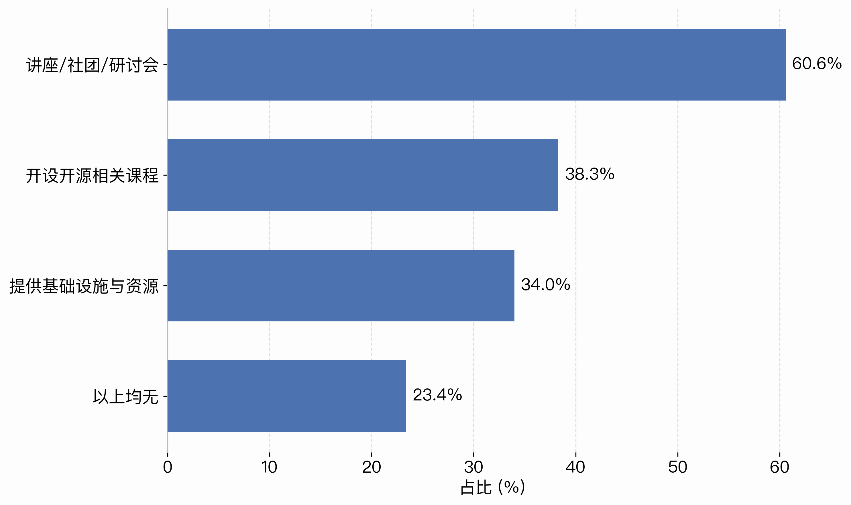有相当比例的受访学生所在高校开设了与开源相关的课程，有部分受访学生所在高校组织了与开源项目相关的讲座、社团或研讨会。另外还有部分受访学生所在高校支持开源项目的基础设施和资源（如服务器、代码托管平台等）。