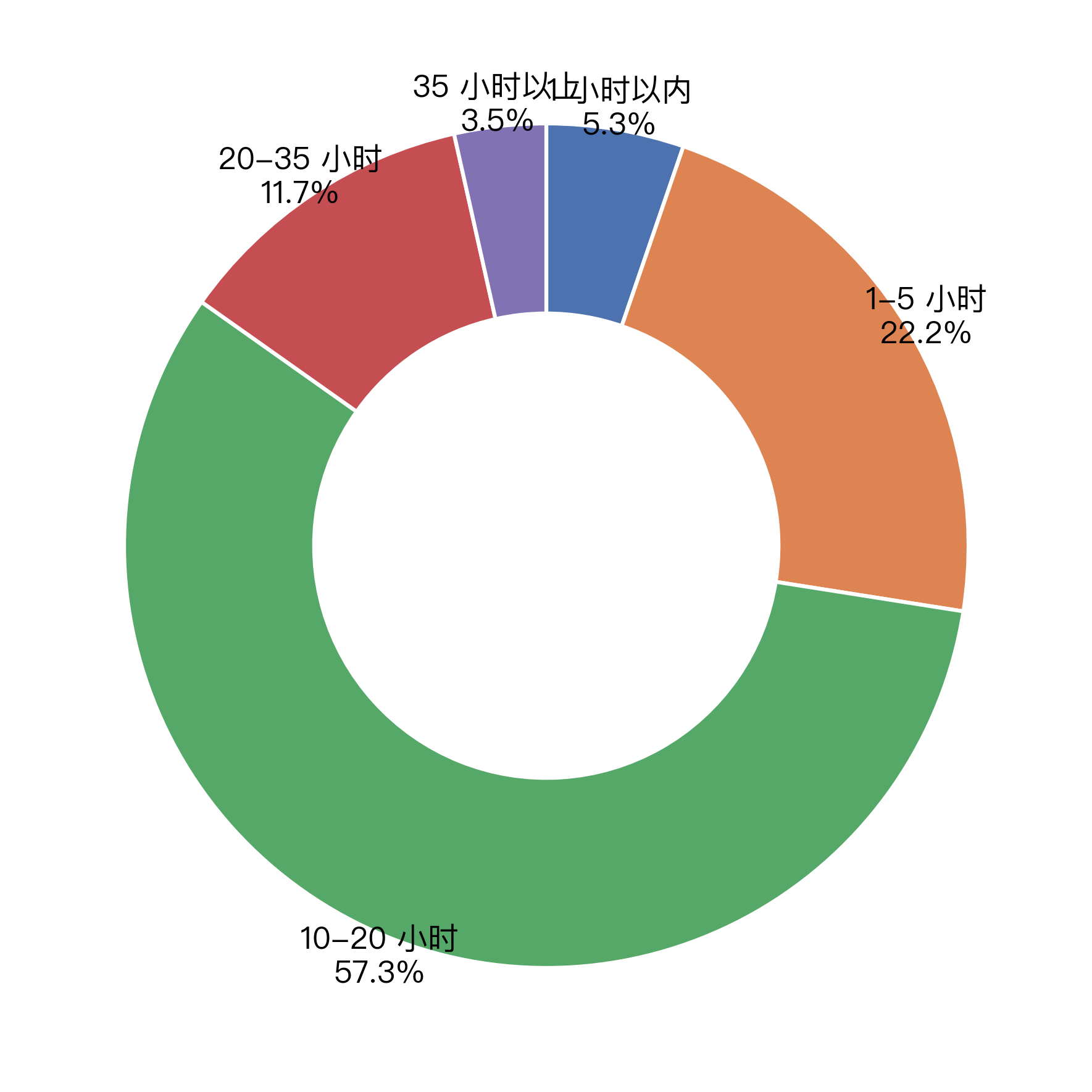 从每周参与开源项目的时长来看，“10–20 小时”区间的受访者最多，接近六成，说明有相当一部分活跃贡献者已经将开源视为规律性的中度投入；其次是“1–5 小时”和“20–35 小时”两个档位，合计约占三成多，而每周投入 35 小时以上的重度参与者只占少数。整体而言，每周超过 20 小时深度投入的受访者合计在一成多，构成了社区的“核心贡献力量”。