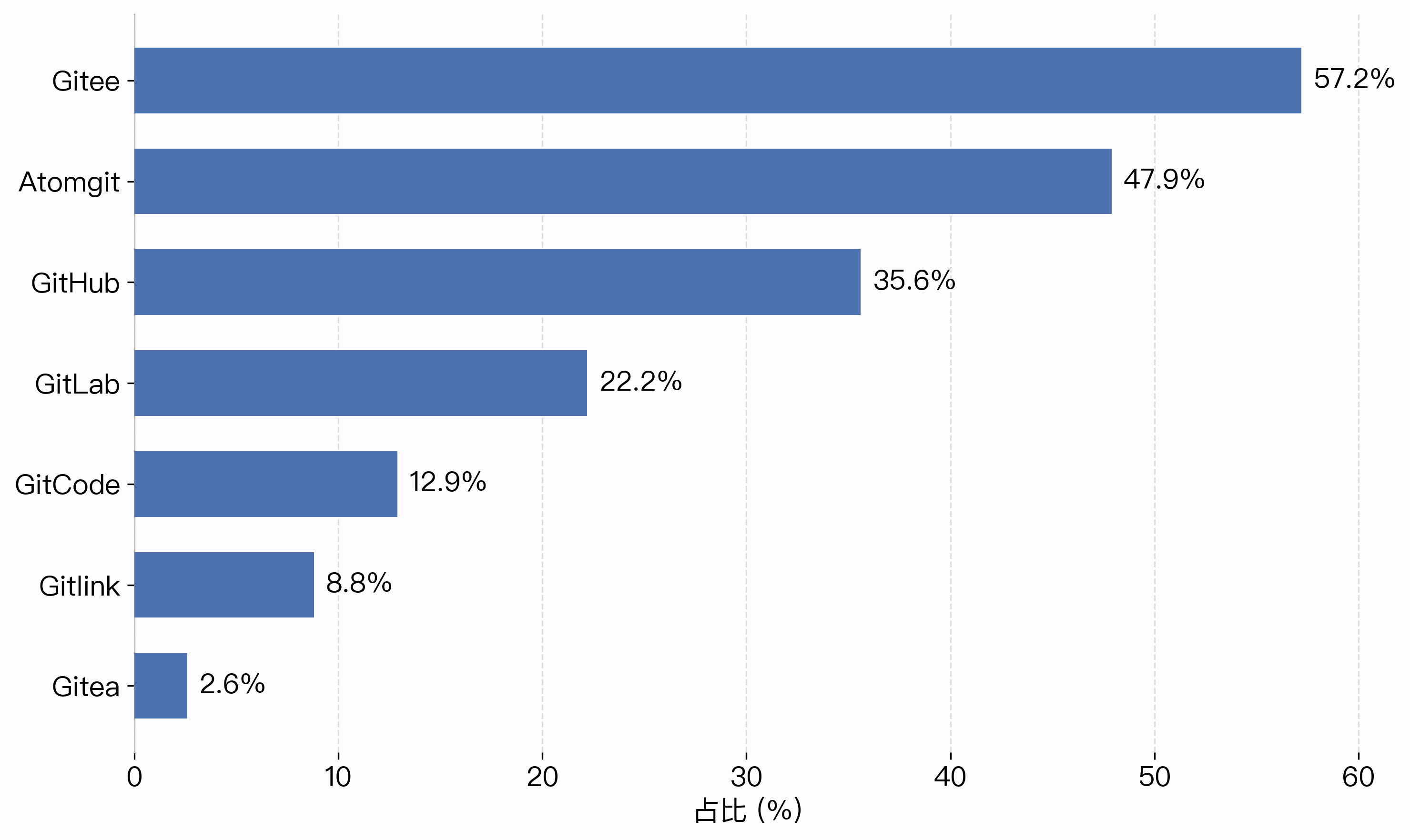在主要开源贡献平台方面，国内平台占据明显优势：Gitee 的使用比例最高，接近六成，紧随其后的是 Atomgit，约在一半左右，而 GitHub 和 GitLab 的使用比例则分别在三成多和两成左右。这表明在国内开发者的实际贡献行为中，本土平台已经成为最重要的承载空间，但海外代码托管平台依然是不可或缺的重要阵地。