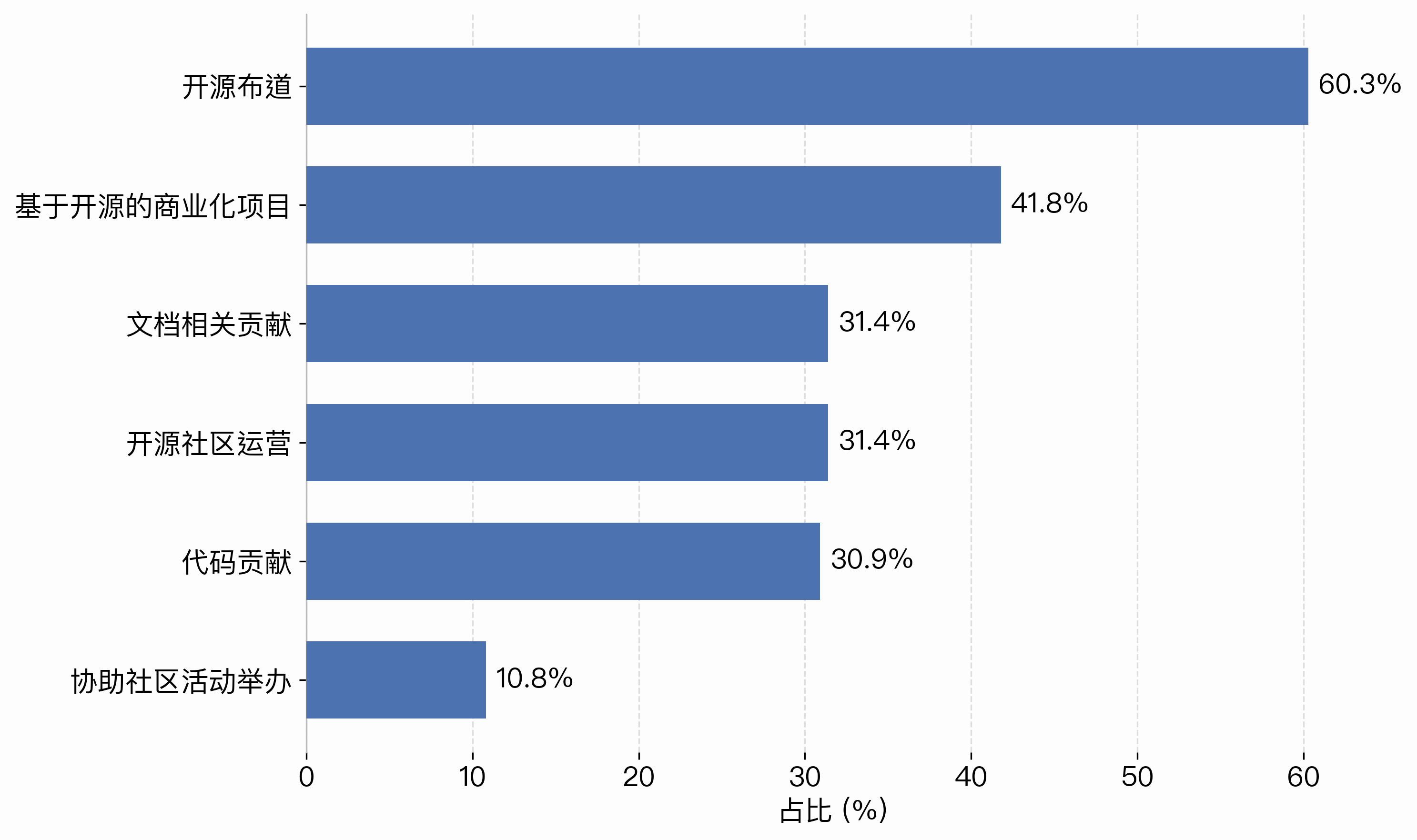 受访者对开源项目的贡献方式呈现多样化，其中“开源布道”是最主要的贡献方式，选择比例超过六成，反映出分享实践、推广项目和内容创作已成为重要的贡献路径；其后是“基于开源的商业化项目”，约有四成多的受访者选择，以及“文档相关贡献”和“开源社区运营”，两者都在三成左右，而直接“代码贡献”的比例与其相当，“协助社区活动举办”的比例则在一成左右。这说明在传统“写代码”之外，围绕运营、布道与商业落地的多元贡献，正在成为开源生态中同样关键的组成部分。