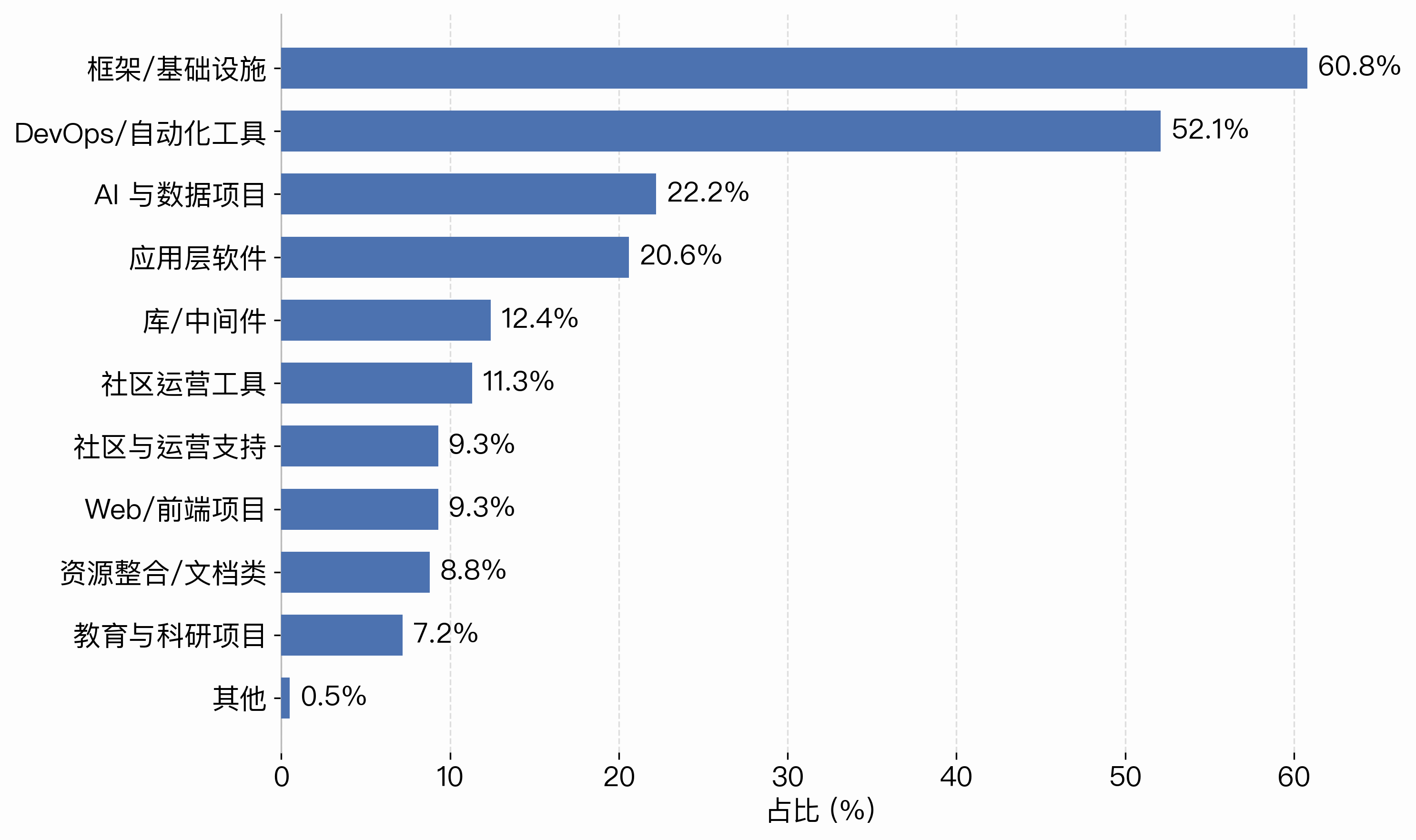 在贡献的项目类型方面，框架 / 基础设施类项目的参与度最高，接近六成，其次是 DevOps / 自动化工具，约占一半左右，AI 与数据项目和应用层软件也具有一定比例，均在两成多到三成之间。库 / 中间件、社区运营工具、教育与科研项目等则共同构成了长尾生态，说明受访者的贡献既集中于技术底座，也覆盖了上层应用与社区支持类项目。