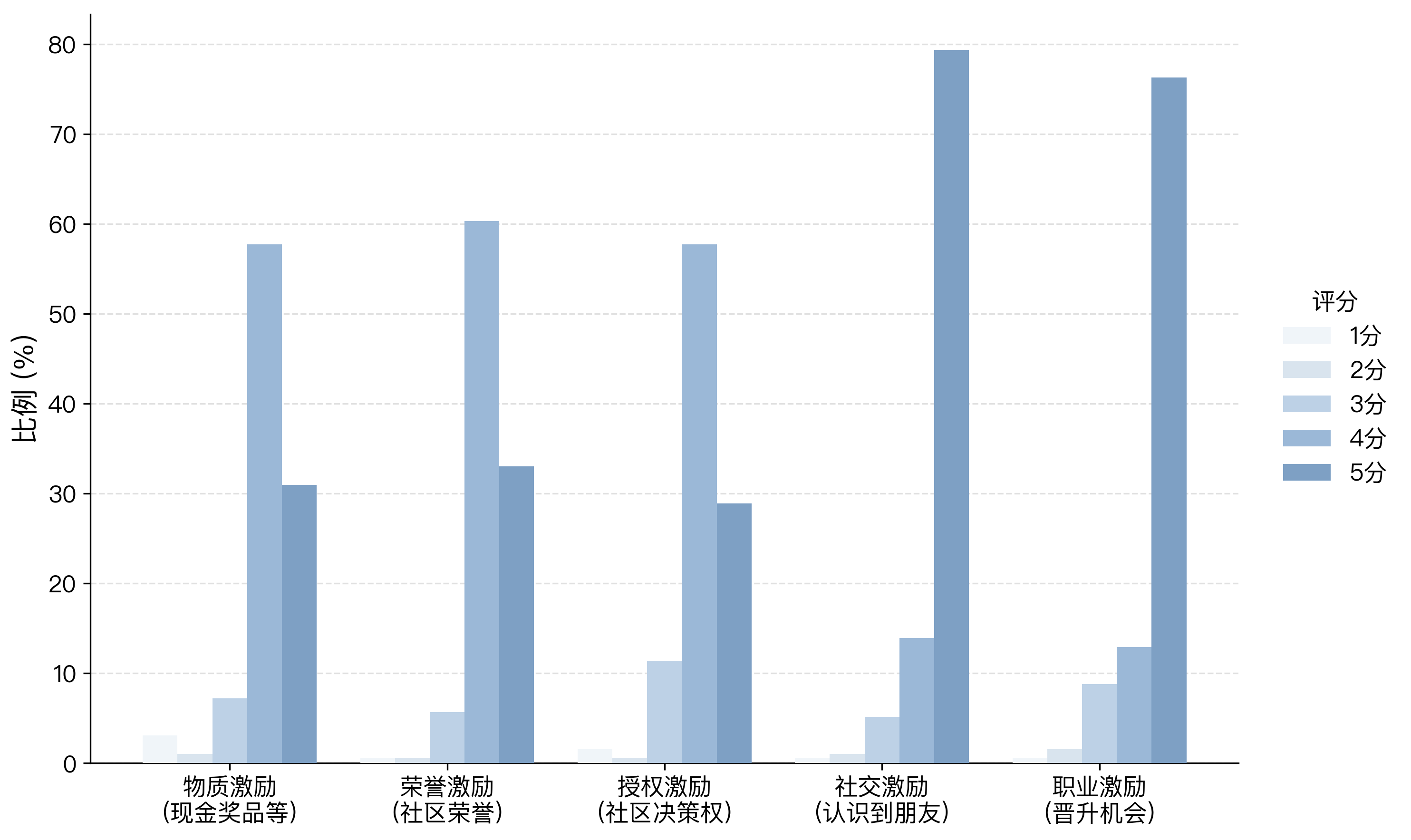 从激励方式的影响程度评分来看，社交激励与职业激励的“高分”比例最高：多数受访者在这两项上打出 4 或 5 分，说明“在社区中结识伙伴”和“获得更好的职业发展机会”是持续参与开源的重要驱动力；物质激励、荣誉激励和授权激励也整体获得了偏高的评价，但相较之下略逊一筹。整体而言，开源社区的激励机制是多维度的，非财务激励（成长、认可、社交与职业）在激发贡献意愿方面尤为关键。