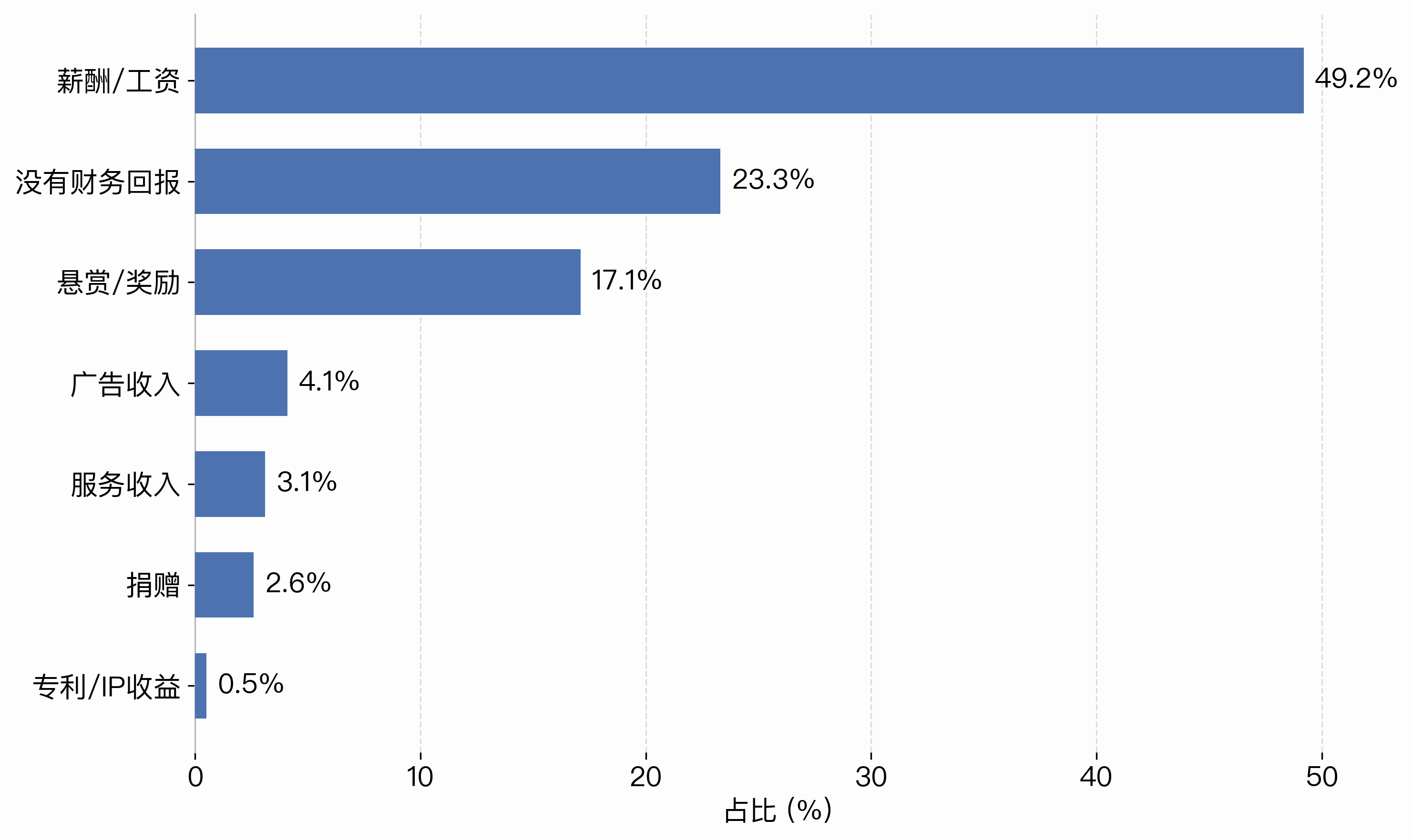 在开源项目的财务回报方面，“薪酬 / 工资”是最主要的直接来源，其次是“没有财务回报”，以及“悬赏 / 奖励”；广告收入、服务收入和捐赠等形式分别处于个位数比例。可见，尽管部分开发者能在工作岗位上通过开源获得收入，但相当一部分参与更多仍出于非财务动机，纯粹依靠爱好、学习与社区认同驱动。