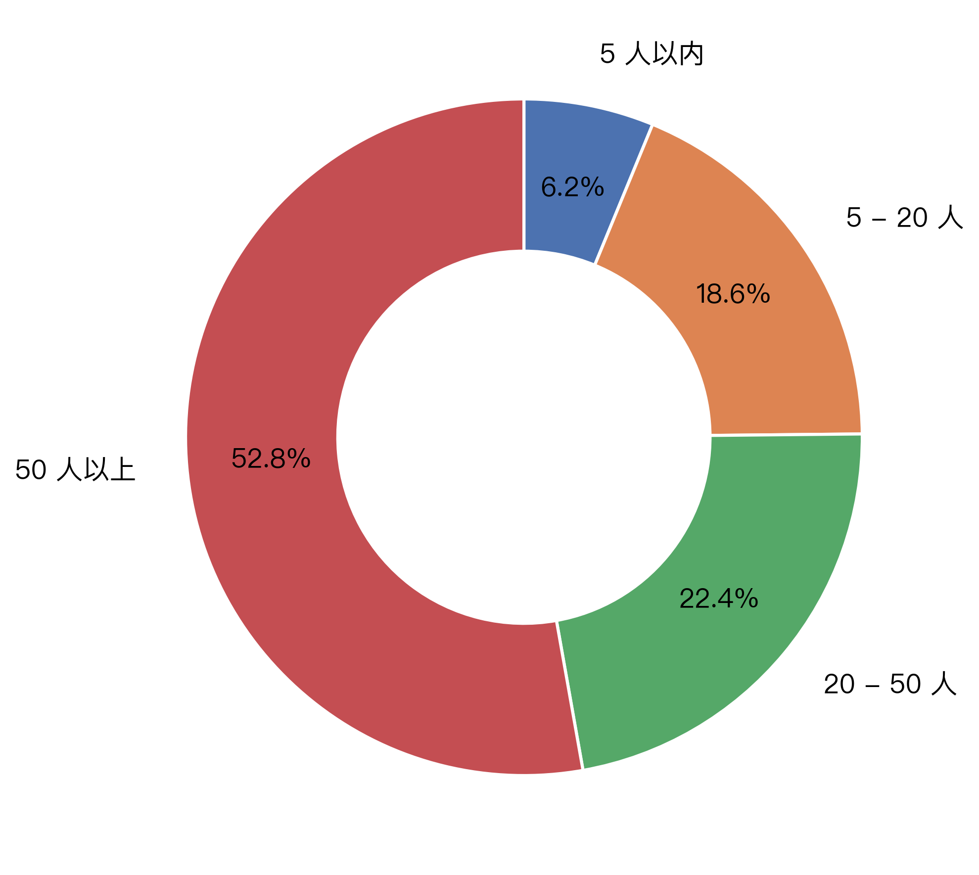 在活跃开发者规模方面，**“50 人以上”的社区占到了约一半**，其次是“20–50 人”和“5–20 人”两个档位，合计约占四成多，而“5 人以内”的社区只占很小一部分。这说明虽然整体用户规模以中小社区为主，但在不少项目中，**活跃开发者群体已经相对可观，为社区的持续演进提供了足够的技术支撑**。
