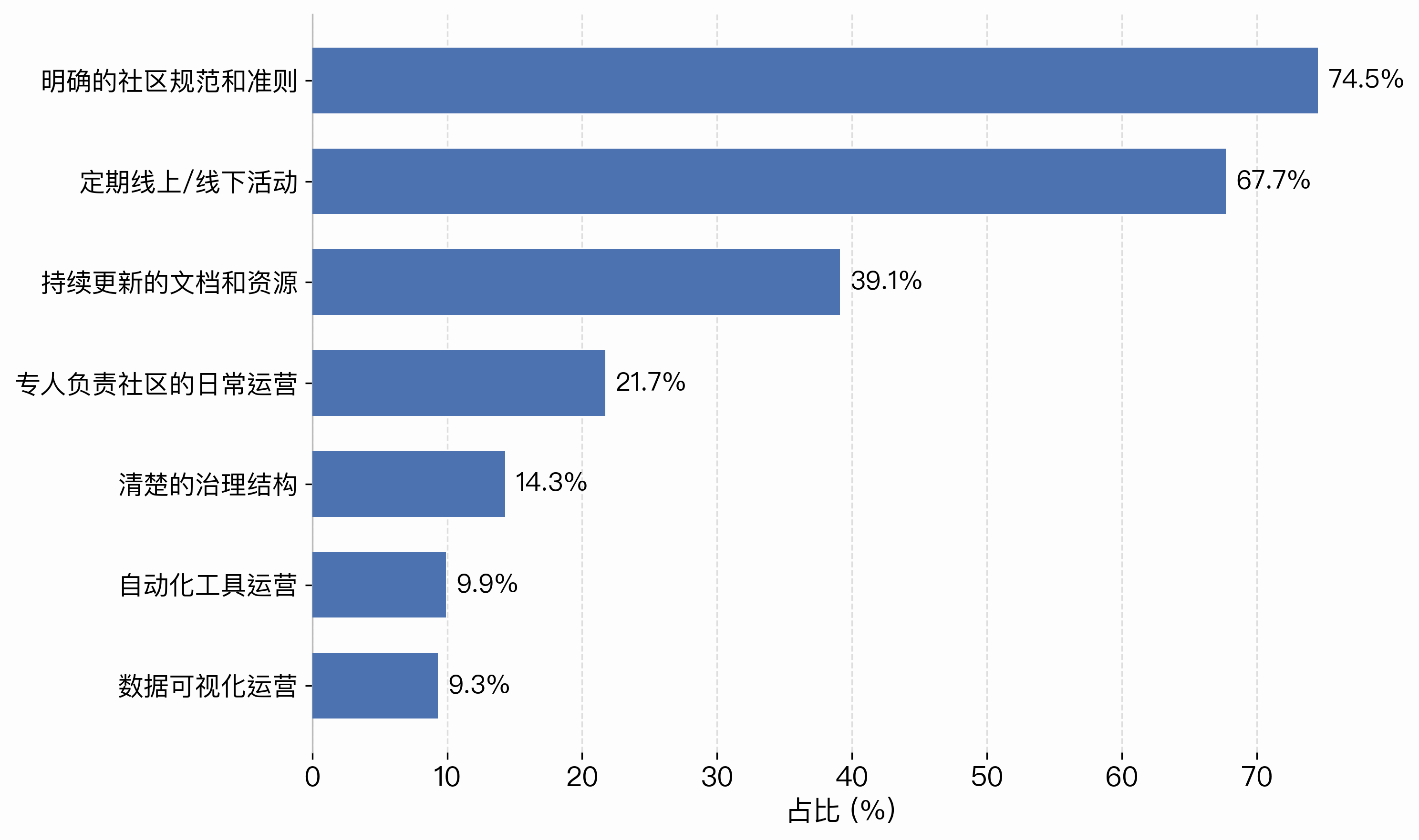 在社区管理方面，多数受访者所在社区已经具备比较清晰的治理结构，并配备了专人负责日常运营，同时也较为重视社区规范与准则的制定。为了帮助新成员更好地融入，不少社区还会持续更新文档和资源，并定期举行线上 / 线下活动，少部分社区开始尝试使用自动化和数据可视化工具辅助运营，整体呈现出“基础治理较为完善、运营工具化程度正在提升”的特征。