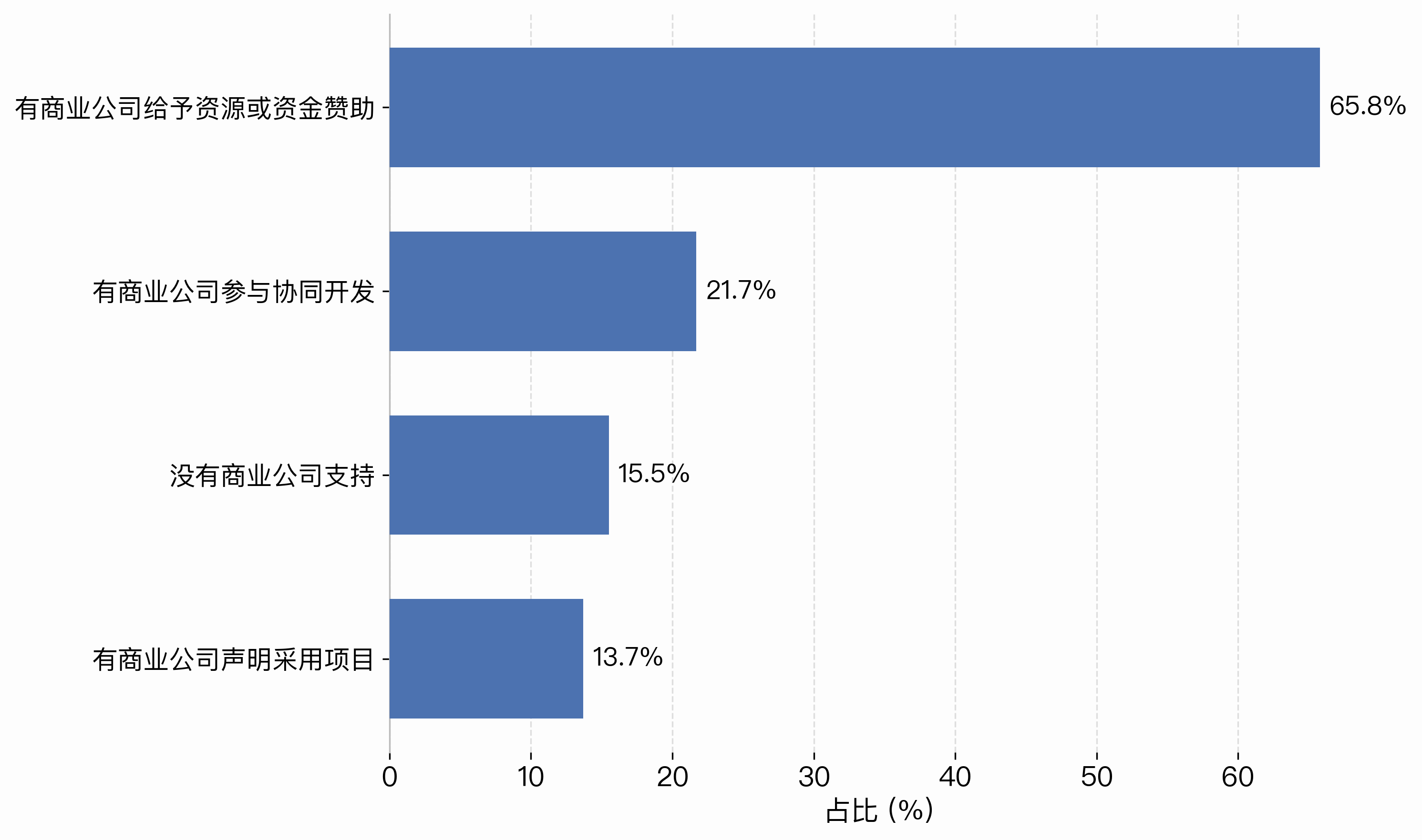 在商业公司的支持方面，有商业公司给予资源或资金赞助是最常见的一种支持方式，比例超过一半；相比之下，“有商业公司参与协同开发”以及“有商业公司声明采用项目”的比例则相对较低，分别在两成左右及以下。仍有一部分社区表示“没有商业公司支持”，这也提示我们商业生态与开源社区之间仍存在尚待打通的空间。