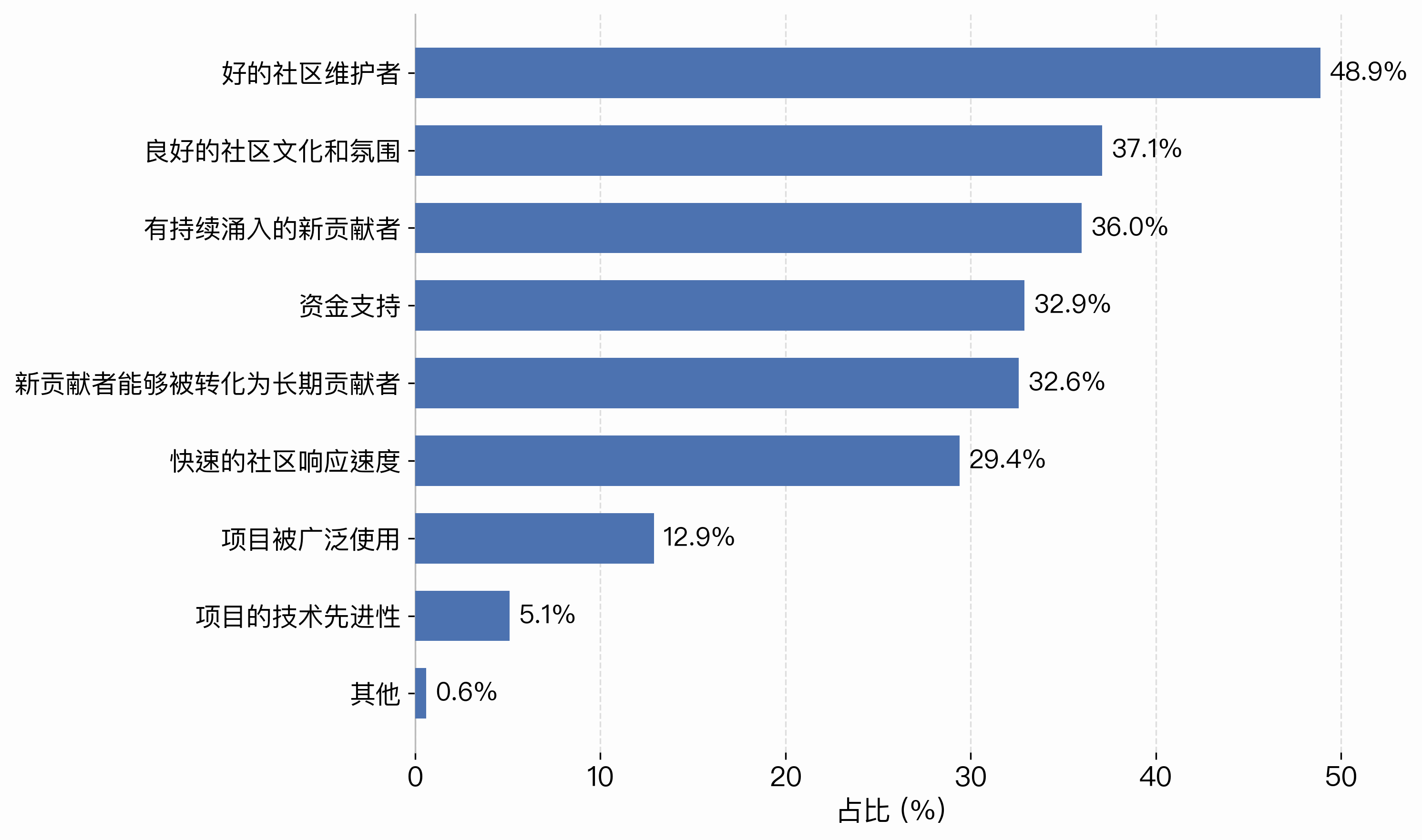 总体而言，受访者普遍认为，影响开源社区健康持续发展的关键因素首先是“好的社区维护者”，这一选项的选择比例最高，其次是“良好的社区文化和氛围”以及“有持续涌入的新贡献者”。资金支持、“新贡献者能够被转化为长期贡献者”和“快速的社区响应速度”等也都被相当一部分人提及，说明大家既关注社区的“人”和“文化”，也关心社区在资源、转化率和响应效率上的综合表现。