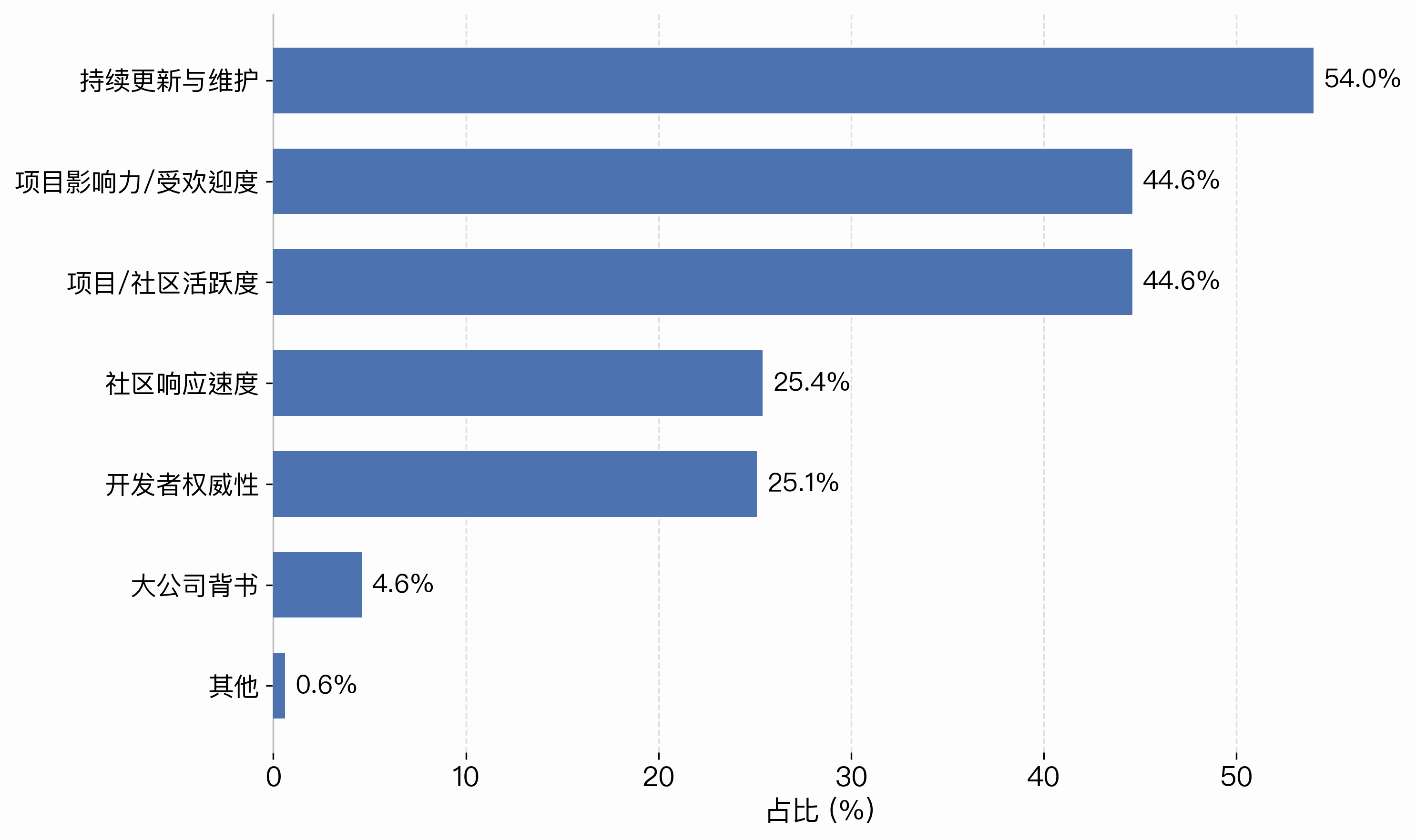 在评价开源项目时，受访者最看重的是“是否有持续的更新和维护”，这一点被一半以上的受访者视为核心指标；其次是“项目是否具有影响力、是否受大众欢迎”以及“项目以及社区的活跃程度”，两者的选择比例大致相当。社区响应速度和开发者的权威性位于第二梯队，而“是否有大公司背书”的重要性相对最低。整体来看，开发者在评价项目时，更强调长期维护能力、真实使用热度与社区活跃度，而非简单的“明星光环”或单一权威背书。