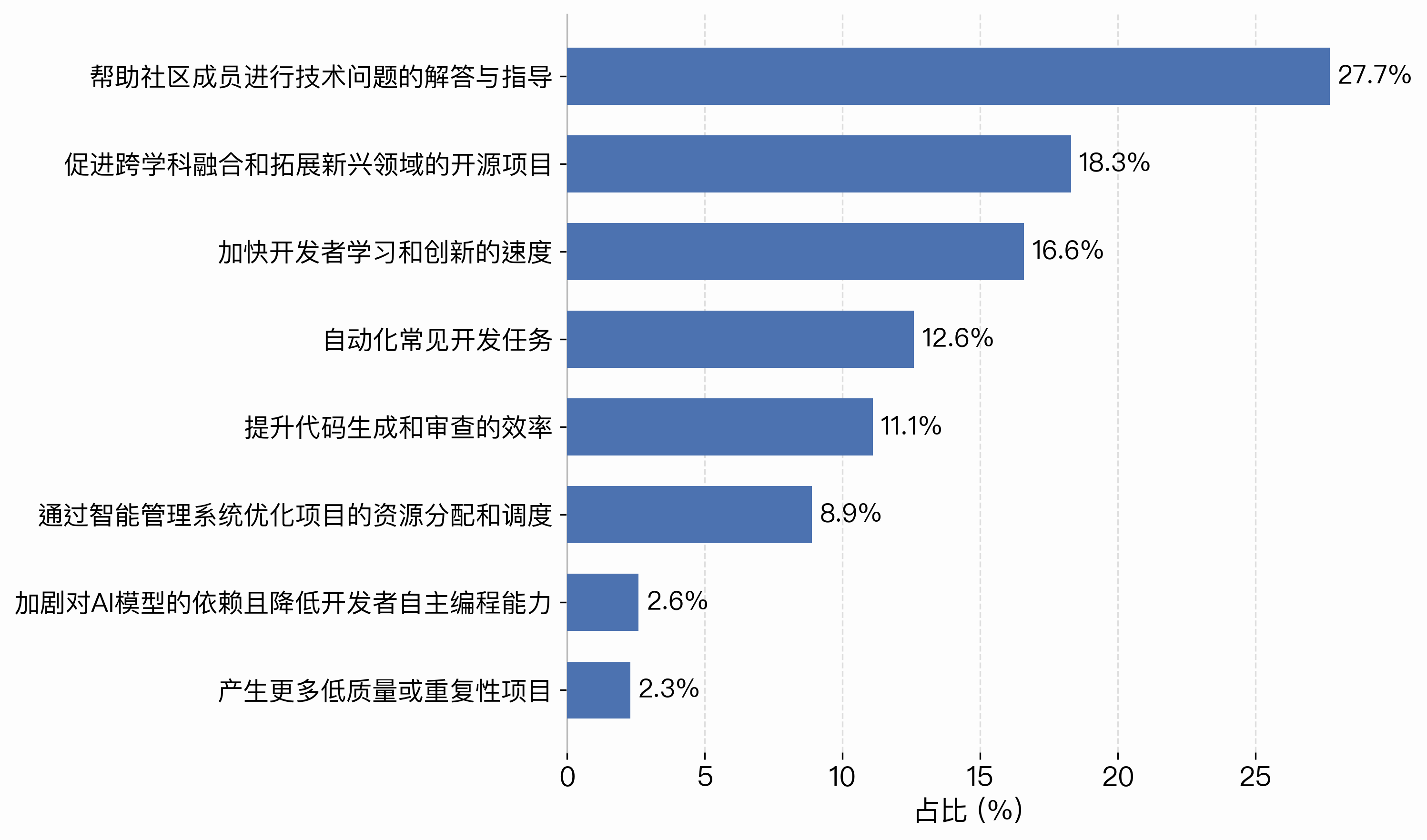 人工智能技术对开源项目和社区产生了深远的影响。其中，被提及最多的是“帮助社区成员进行技术问题的解答与指导”，这一点体现了 AI 在知识获取和日常支持上的直接价值；其次是“促进跨学科融合、拓展新兴领域项目”以及“加快开发者学习和创新的速度”。此外，受访者也提到 AI 在自动化常见开发任务、提升代码生成和审查效率、优化资源分配等方面的潜力；与此同时，也有少部分人担心 AI 可能产生更多低质量或重复性项目，或加剧对模型的依赖，影响开发者的自主编程能力。