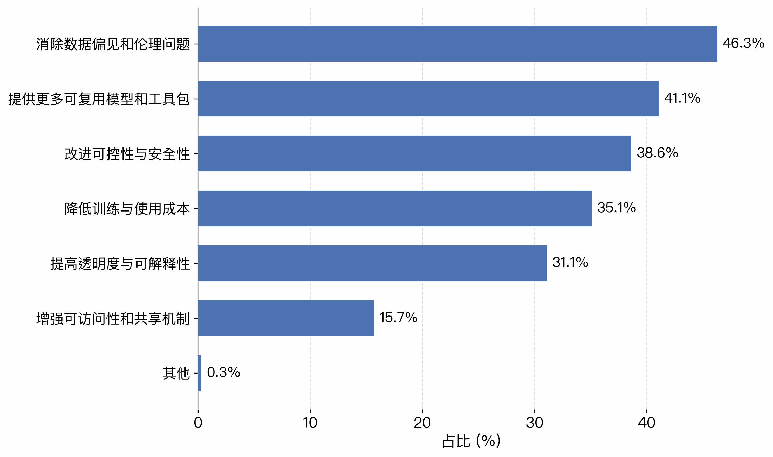 在开源大模型的发展过程中，面临的技术挑战同样多元。被提及最多的挑战是“消除模型中的数据偏见和伦理问题”，其次是“提供更多可复用的开源模型和工具包”以及“改进大模型在实际应用中的可控性与安全性”，这三项合计占据了相当大的比重；降低模型的训练与使用成本、提高模型的透明度与可解释性也都被不少受访者视为关键问题。与此同时，增强大模型在开源社区的可访问性和共享机制虽然提及比例略低，但同样关乎生态的长期繁荣。这些挑战的解决将有助于开源大模型的健康发展和广泛应用。