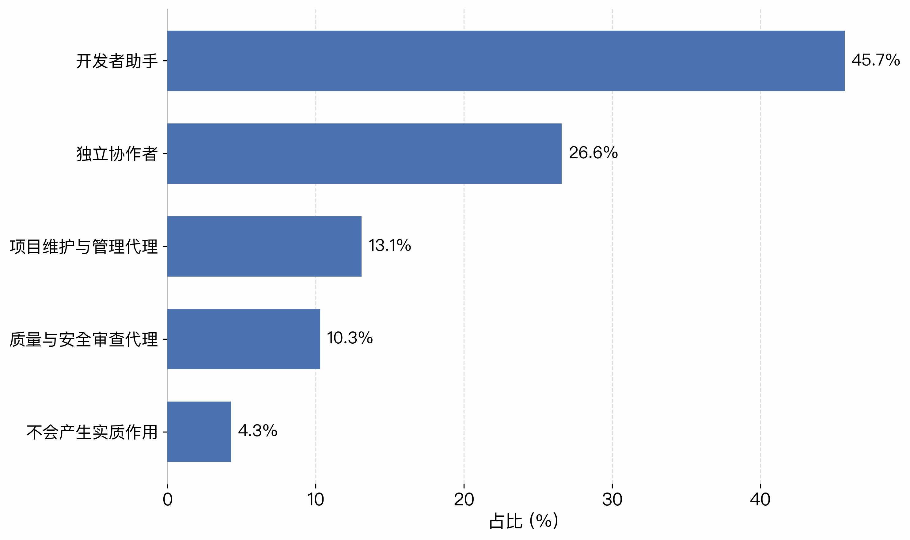 受访者对 AI Agent 在未来开源社区中的角色持有不同观点。整体来看，“开发者助手”这一角色最被广泛认可，接近一半的受访者将其视为主要定位；其次是“独立协作者”和“项目维护与管理代理”，两者合计也占据了不小比例。同时，还有部分受访者期待 AI Agent 在质量与安全审查方面发挥作用，或对其未来作用持保留态度，认为“不会产生实质作用”的仍是少数。