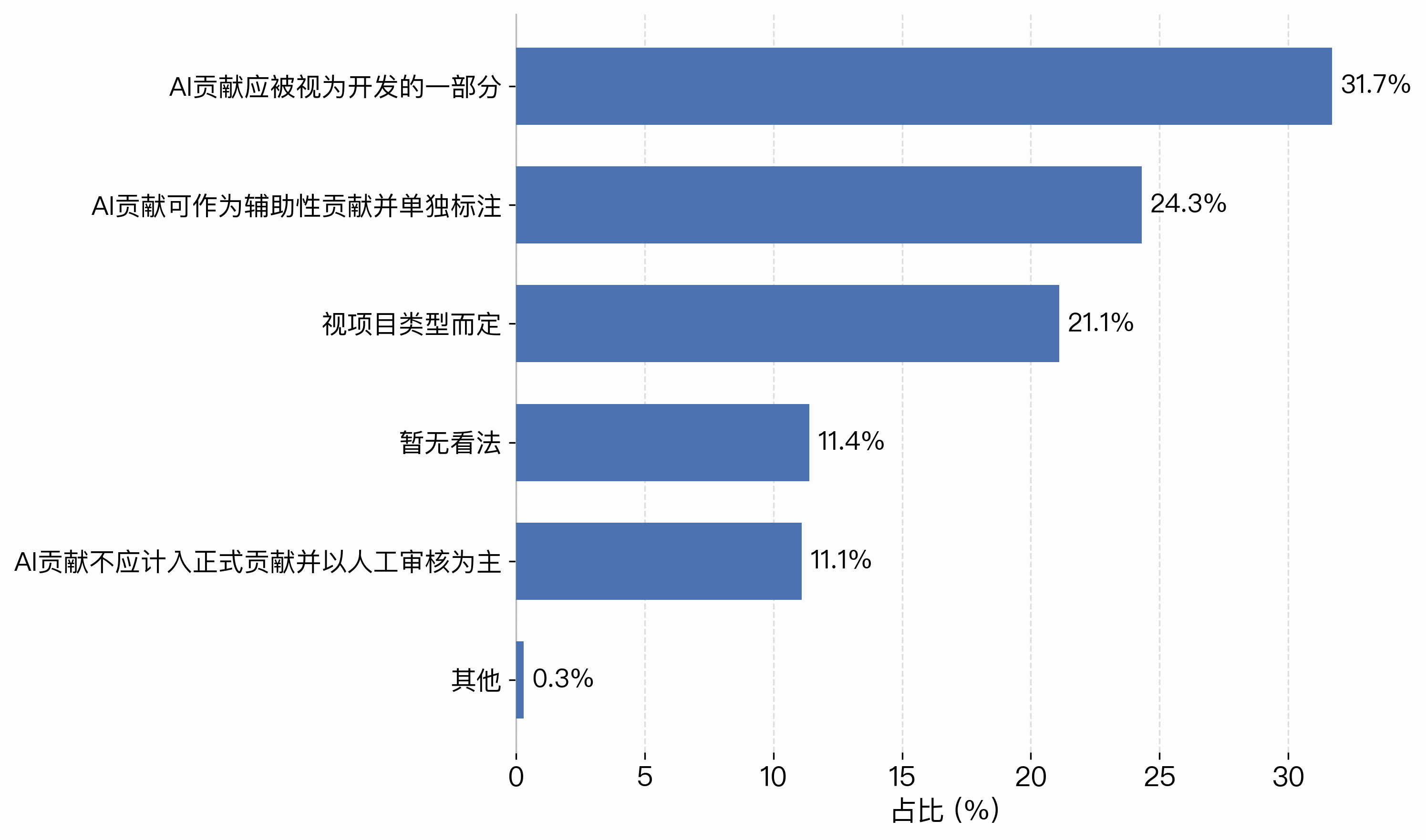 关于 AI 辅助开源贡献是否应被视为正式贡献，受访者的观点存在明显分歧：认为“应该视为开发的一部分”的比例最高，其次是“可以视为辅助性贡献但需单独标注”和“视项目类型而定”，三者合计超过七成；也有一部分人选择“不确定 / 暂无看法”或坚持“应以人工审核为主，不计入正式贡献”。这反映出社区在如何界定 AI 参与与人类贡献边界上，仍在形成共识的过程中。