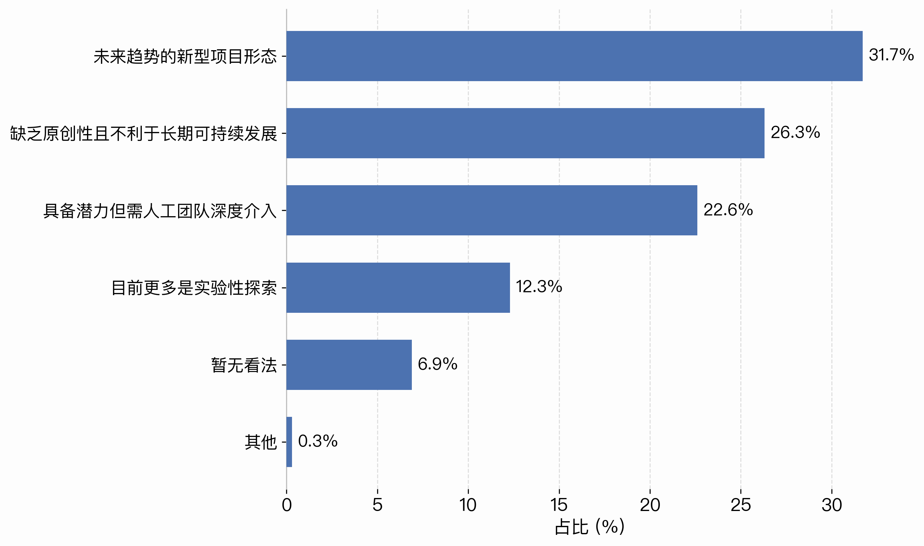 关于 AI 原生开源项目，受访者的观点同样多样化。一部分人认为这是未来趋势，将成为新型项目形态；也有人认为这一方向“有潜力，但需要人工团队深度介入”；还有相当比例的受访者担心当前不少 AI 原生项目缺乏原创性，不利于长期可持续发展，或者认为目前仍以实验性探索为主，持观望态度的人也并不少见。