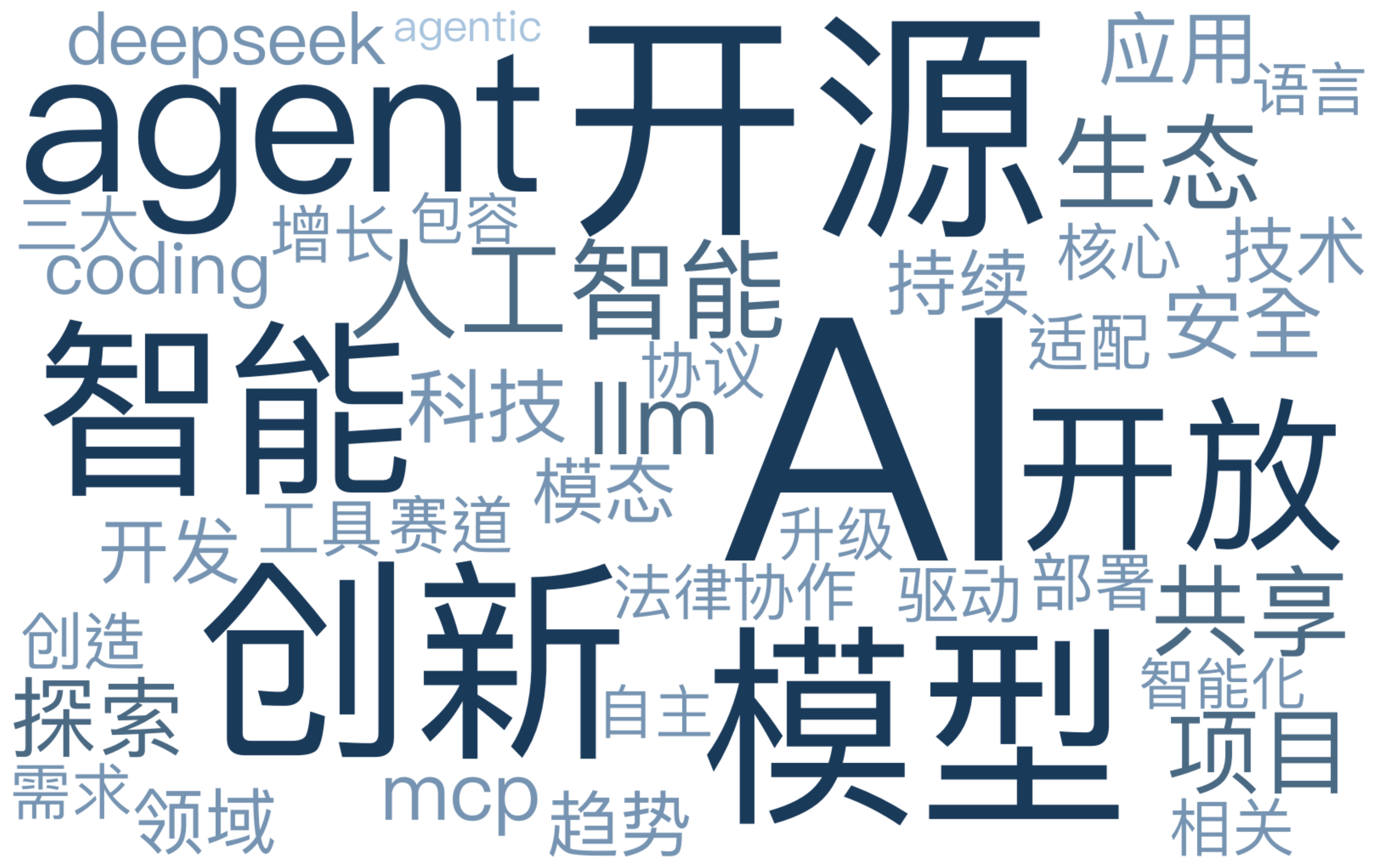 根据 2025 年开源关键词词云图，可以看到“AI”“模型”“智能”“大模型”“创新”“agent”等词汇在所有词语中出现频次最高，技术创新和大模型相关议题无疑是今年的绝对主轴；同时，“开源”“共享”“开放”“生态”“项目”“探索”等关键词，凸显了开源生态与协同创新的重要性；“安全”“应用”“MCP”等词语则表明，受访者不仅关注技术本身，也关注其在实际落地和安全性层面的挑战与机遇。