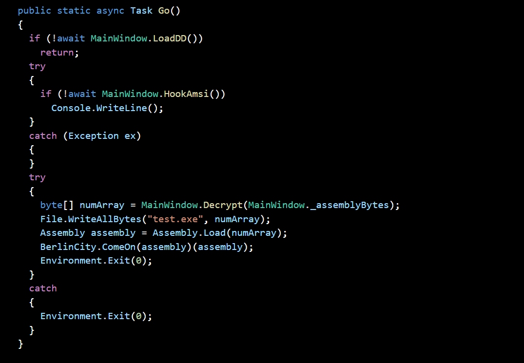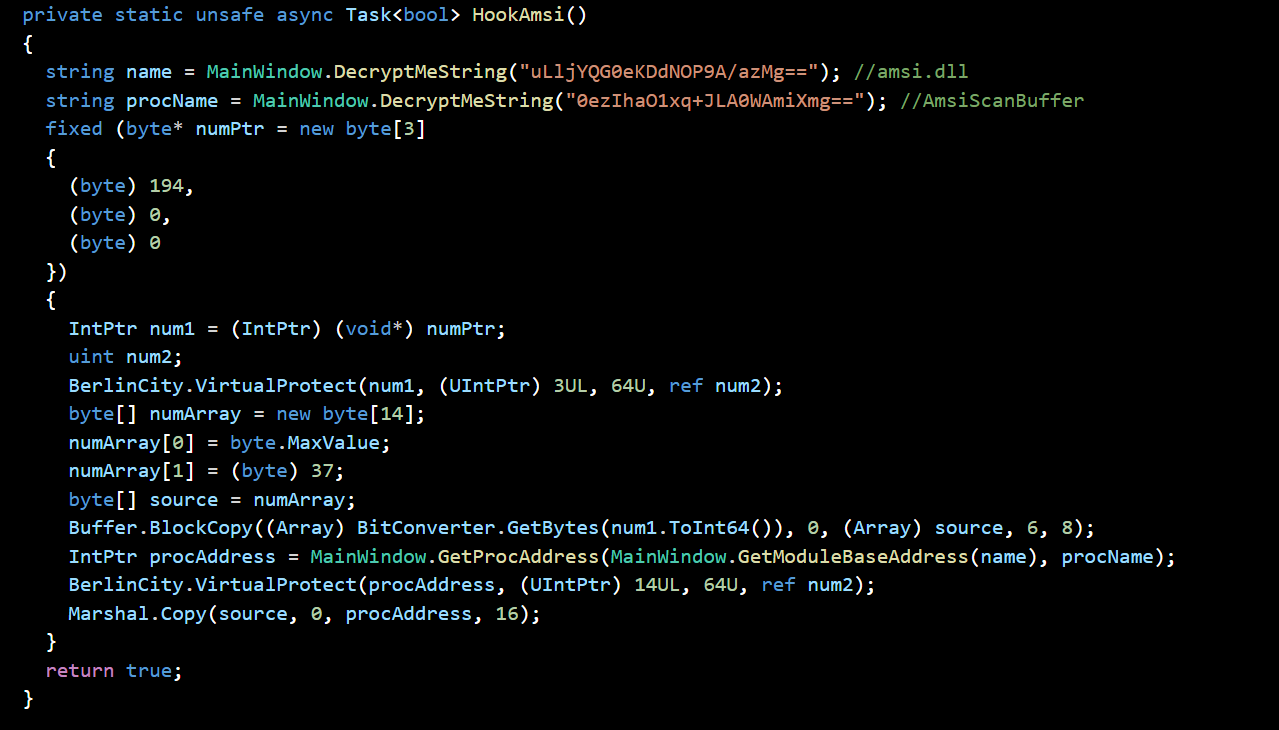 then i using dotpeek to dump all c# source code.then i found it have two main behavior one is patch amsi.dll function AmsiScanBuffer.