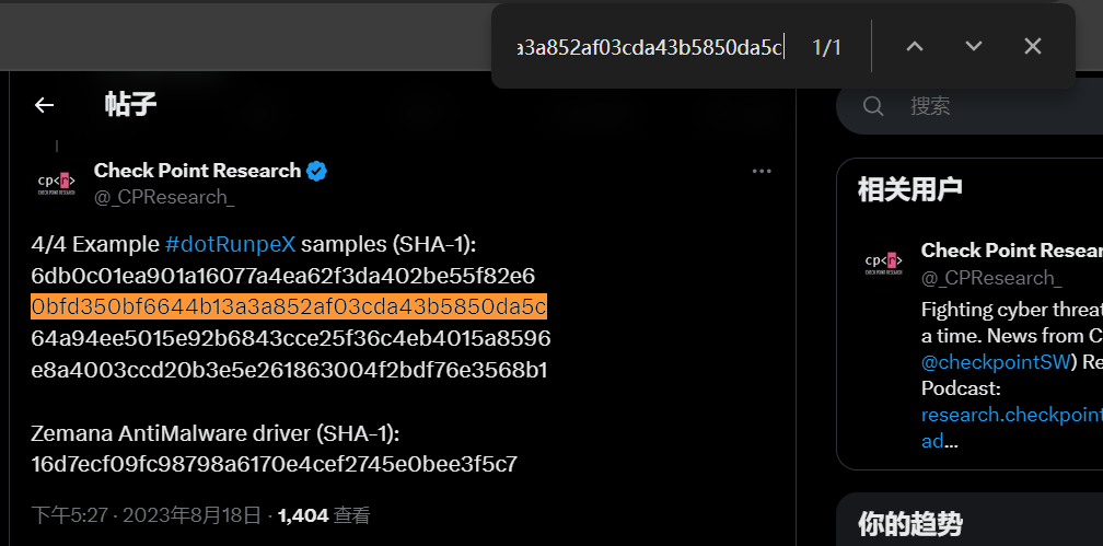 But as we know, the file sha256 released by the sample of this chal is `a636769bcc6e11b5a9be209faa164fc778df5ee6e34ae53a6eeb440314f79929`
