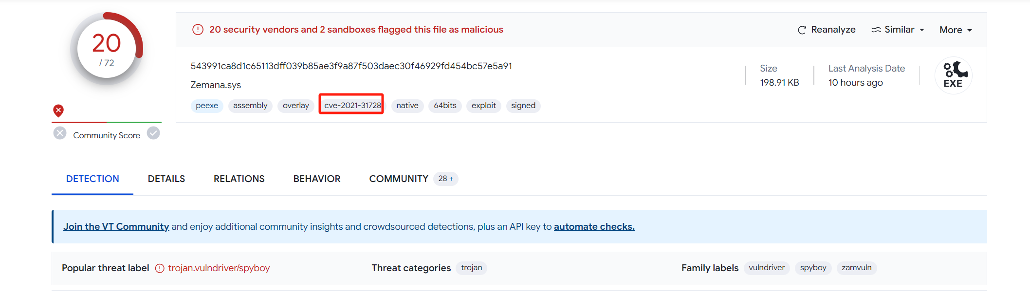 Wait, the story doesn't end here. When I was checking virustotal for some related information about the file, a driver named `Zemana.sys` came into my view.