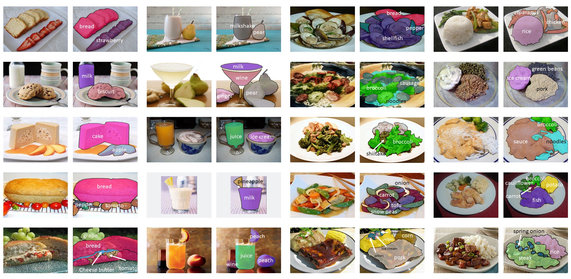 0: background, 1: candy, 2: egg tart, 3: french fries, 4: chocolate, 5: biscuit, 6: popcorn, 7: pudding, 8: ice cream, 9: cheese butter, 10: cake, 11: wine, 12: milkshake,13: coffee, 14: juice, 15: milk, 16: tea, 17: almond,18: red beans, 19: cashew, 20:dried cranberries, 21: soy, 22:walnut, 23: peanut, 24: egg, 25:apple, 26: date, 27: apricot, 28: avocado, 29: banana, 30: strawberry, 31: cherry, 32: blueberry, 33: raspberry, 34: mango, 35: olives, 36 :peach, 37 lemon, 38: pear, 39: fig, 40:pineapple, 41: grape, 42: kiwi, 43: melon, 44: orange, 45: watermelon, 46: steak, 47: pork, 48: chicken duck, 49: sausage, 50 :fried meat, 51: lamb, 52: sauce, 53: crab, 54: fish, 55: shellfish, 56 :shrimp, 57: soup, 58: bread, 59: corn, 60: hamburg, 61: pizza, 62: hanamaki baozi, 63: wonton dumplings, 64: pasta, 65: noodles, 66: rice, 67: pie, 68 :tofu, 69: eggplant, 70: potato, 71: garlic, 72: cauliflower, 73: tomato, 74 :kelp, 75: seaweed, 76: spring onion, 77: rape, 78: ginger, 79: okra, 80: lettuce, 81: pumpkin, 82: cucumber, 83: white radish, 84: carrot, 85: asparagus, 86: bamboo shoots, 87: broccoli, 88: celery stick, 89: cilantro mint, 90: snow peas, 91: cabbage, 92: bean sprouts, 93: onion, 94: pepper, 95: green beans, 96 :French beans, 97: king oyster mushroom, 98: shiitake, 99: enoki mushroom, 100 : oyster mushroom, 101: white button mushroom, 102: salad, 103: other ingredients