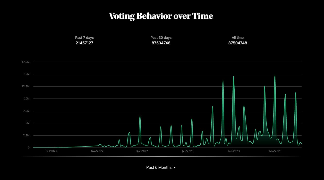 Voting behavior over time has been trending up, which means BottoDAO members are more engaged than in the past.