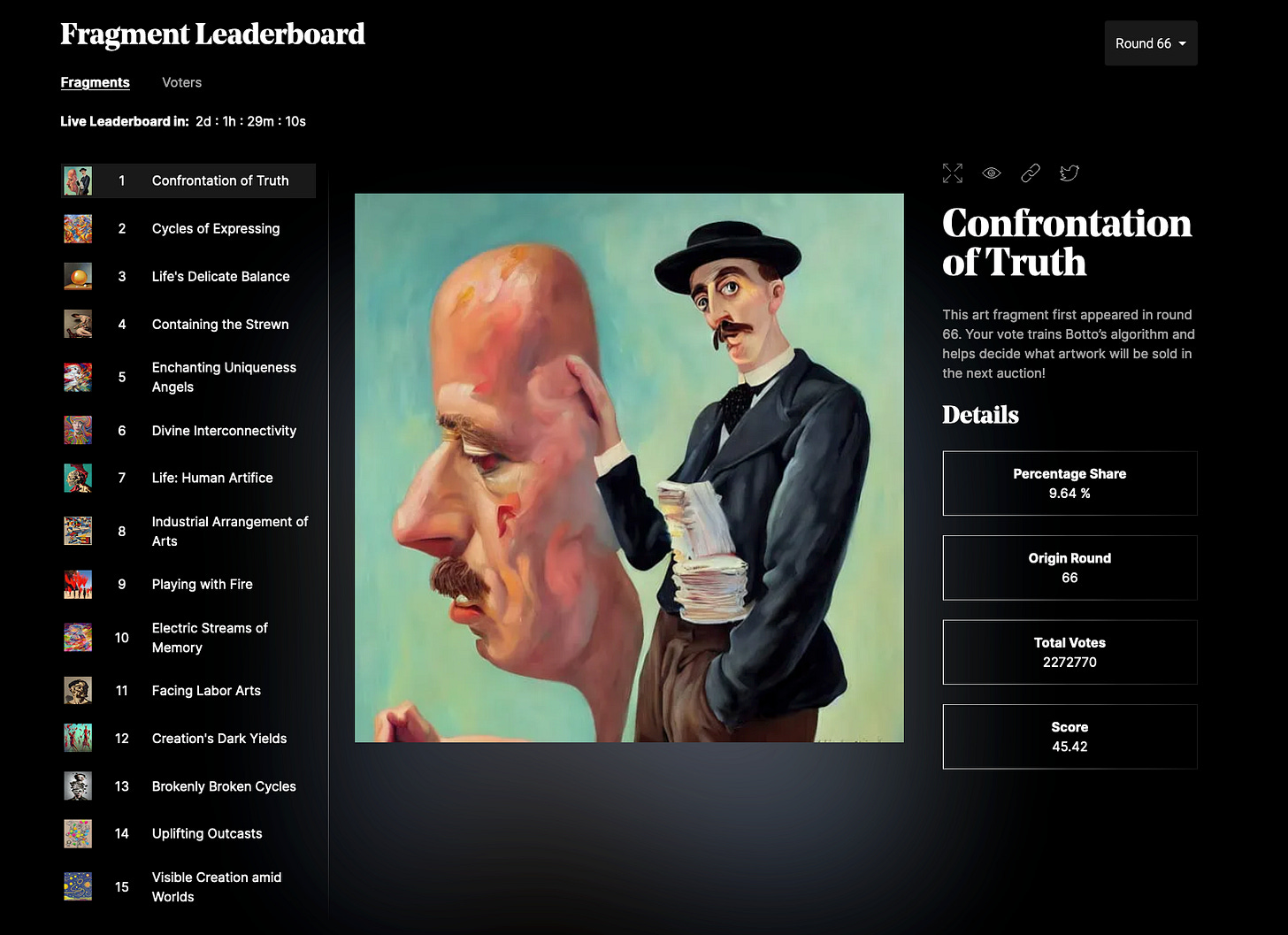 The leaderboard showcases the artwork leading the current round and other pieces. You can also see the selected artworks from past rounds. “_Confrontation of Truth”_ is leading the current round (pictured).