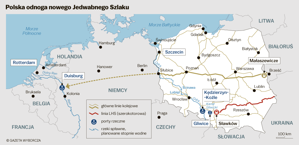 Najważniejszą w Polsce linią kontenerową, a zarazem częścią nowego Jedwabnego Szlaku, jest trasa ze wschodu na zachód, na której dominują Małaszewicze na granicy polsko-białoruskiej. Znajduje się tam ogromny terminal przeładunkowy, który obsługuje ruch między Dalekim Wschodem a UE. Tylko w 2018 r. przez Małaszewicze przejechało ponad 300 tys. kontenerów, a za dziesięć lat ta liczba może się podwoić.