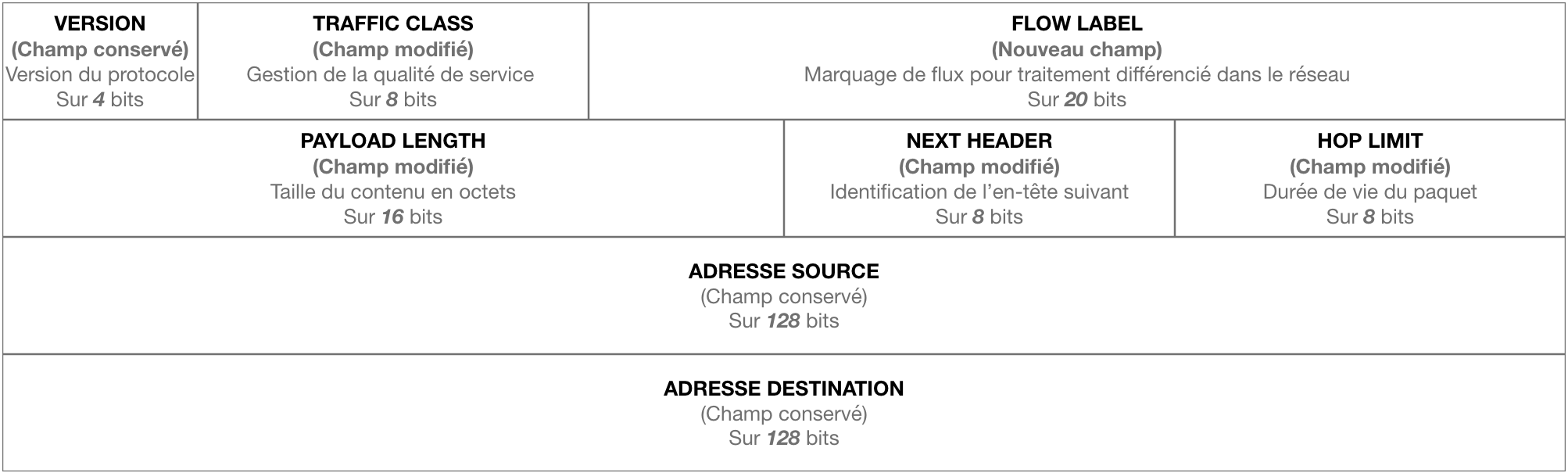 - Il y a une implémentation native du multicast (optionnel et défini à postériori en IPv4) et d'IPsec en IPv6.