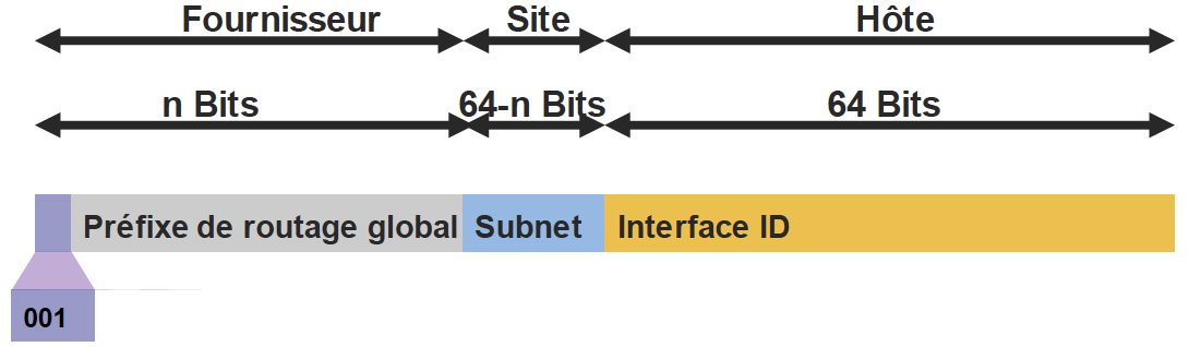 Ces adresses sont équivalentes aux adresses publiques IPv4, routables aussi bien dans un réseau privé que sur Internet. La plage d’adresses 2000::/3 est réservée par l’IANA pour l’adressage publique (toutes les adresses commençant par les valeurs 2 et 3).