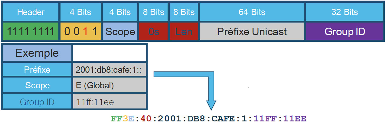 > Remarque: La notion de broadcast n'existe plus en IPv6 ! Elle est remplacée par une prise en charge native du multicast.
