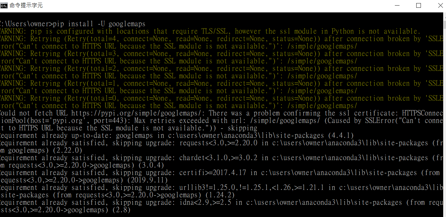 * "Could not fetch URL https://pypi.org/simple/googlemaps/: There was a problem confirming the ssl certificate: HTTPSConnectionPool(host='pypi.org', port=443): Max retries exceeded with url: /simple/googlemaps/ (Caused by SSLError("Can't connect to HTTPS URL because the SSL module is not available.")) - skipping"*