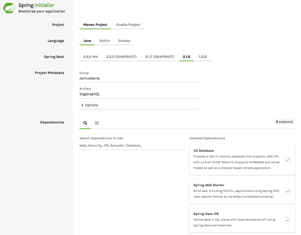 * Add the H2 Database, Spring Web Starter, and the Spring Data JPA dependencies before generating the project.