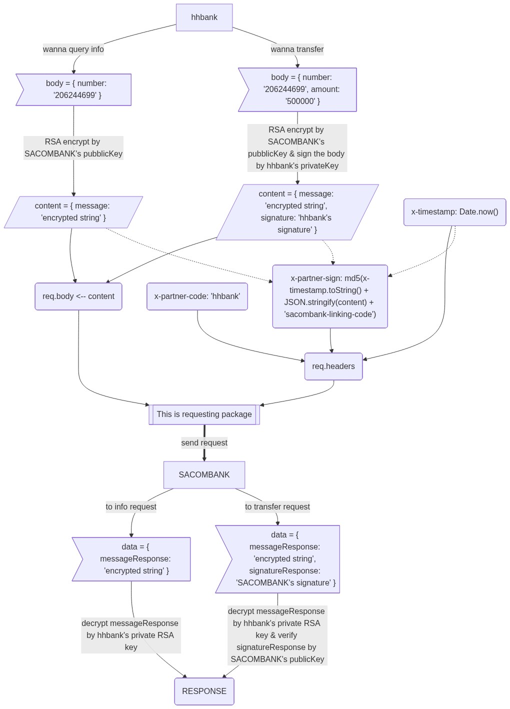 # :memo: Internet Banking API --- ## :loudspeaker: Thông tin nhóm | STT | Họ và tên | MSSV | | -------- | -----------------------|-------- | | 1 | Nguyễn Xuân Nghiêm | 1612427 | | 2 | Ngô Trần Nguyễn | 1612447 | | 3 | Phùng Trí Cường | 1612074 | ## :rocket: Running + type: `nodemon` + host : [https://sacombank-internet-banking.herokuapp.com](https://sacombank-internet-banking.herokuapp.com/) ## SERVICE API: + query account: `./services/accounts/info` + transfer: `./services/accounts/transfer` --- + FLOW: [](https://mermaid-js.github.io/mermaid-live-editor/#/edit/eyJjb2RlIjoiZ3JhcGggVERcbiAgQVtoaGJhbmtdXG4gIGJvZHlpbmZvPlwiYm9keSA9IHsgbnVtYmVyOiAnMjA2MjQ0Njk5JyB9XCJdXG4gIGJvZHl0cmFuc2Zlcj5cImJvZHkgPSB7IG51bWJlcjogJzIwNjI0NDY5OScsIGFtb3VudDogJzUwMDAwMCcgfVwiXVxuICBlbmNyeXB0ZWRCb2R5SW5mb1svXCJjb250ZW50ID0geyBtZXNzYWdlOiAnZW5jcnlwdGVkIHN0cmluZycgfVwiL11cbiAgZW5jcnlwdGVkQm9keVRyYW5zZmVyWy9cImNvbnRlbnQgPSB7IG1lc3NhZ2U6ICdlbmNyeXB0ZWQgc3RyaW5nJywgc2lnbmF0dXJlOiAnaGhiYW5rJ3Mgc2lnbmF0dXJlJyB9XCIvXVxuICB0cyhcIngtdGltZXN0YW1wOiBEYXRlLm5vdygpXCIpXG4gIHNpZ24oXCJ4LXBhcnRuZXItc2lnbjogbWQ1KHgtdGltZXN0YW1wLnRvU3RyaW5nKCkgKyBKU09OLnN0cmluZ2lmeShjb250ZW50KSArICdzYWNvbWJhbmstbGlua2luZy1jb2RlJylcIilcbiAgY29kZShcIngtcGFydG5lci1jb2RlOiAnaGhiYW5rJ1wiKVxuICBwYWNrYWdlUmVxdWVzdFtbVGhpcyBpcyByZXF1ZXN0aW5nIHBhY2thZ2VdXVxuICBBIC0tIHdhbm5hIHF1ZXJ5IGluZm8gLS0-IGJvZHlpbmZvXG4gIEEgLS0gd2FubmEgdHJhbnNmZXIgLS0-IGJvZHl0cmFuc2ZlclxuICBib2R5aW5mbyAtLSBSU0EgZW5jcnlwdCBieSBTQUNPTUJBTksncyBwdWJibGljS2V5IC0tPiBlbmNyeXB0ZWRCb2R5SW5mb1xuICBib2R5dHJhbnNmZXIgLS0gUlNBIGVuY3J5cHQgYnkgU0FDT01CQU5LJ3MgcHViYmxpY0tleSAmIHNpZ24gdGhlIGJvZHkgYnkgaGhiYW5rJ3MgcHJpdmF0ZUtleSAtLT4gZW5jcnlwdGVkQm9keVRyYW5zZmVyXG4gIGFzc2lnbihyZXEuYm9keSA8LS0gY29udGVudClcbiAgZW5jcnlwdGVkQm9keUluZm8gLS0-IGFzc2lnblxuICBlbmNyeXB0ZWRCb2R5VHJhbnNmZXIgLS0-IGFzc2lnblxuICBhc3NpZ24gLS0-IHBhY2thZ2VSZXF1ZXN0XG4gIGhlYWRlcihyZXEuaGVhZGVycylcbiAgdHMgLS0-IGhlYWRlclxuICB0cyAtLi0-IHNpZ25cbiAgc2lnbiAtLT4gaGVhZGVyXG4gIGNvZGUgLS0-IGhlYWRlclxuICBoZWFkZXIgLS0-IHBhY2thZ2VSZXF1ZXN0XG4gIGVuY3J5cHRlZEJvZHlJbmZvIC0uLT4gc2lnblxuICBlbmNyeXB0ZWRCb2R5VHJhbnNmZXIgLS4tPiBzaWduXG4gIHBhY2thZ2VSZXF1ZXN0ID09c2VuZCByZXF1ZXN0PT0-IFxuICBTQUNPTUJBTksgLS0gdG8gaW5mbyByZXF1ZXN0IC0tPnJlc3BvbnNlSW5mb1xuICBTQUNPTUJBTksgLS10byB0cmFuc2ZlciByZXF1ZXN0IC0tPnJlc3BvbnNlVHJhbnNmZXJcbiAgcmVzcG9uc2VJbmZvPlwiZGF0YSA9IHsgbWVzc2FnZVJlc3BvbnNlOiAnZW5jcnlwdGVkIHN0cmluZycgfVwiXVxuICByZXNwb25zZVRyYW5zZmVyPlwiZGF0YSA9IHsgbWVzc2FnZVJlc3BvbnNlOiAnZW5jcnlwdGVkIHN0cmluZycsIHNpZ25hdHVyZVJlc3BvbnNlOiAnU0FDT01CQU5LJ3Mgc2lnbmF0dXJlJyB9XCJdXG4gIHJlc3BvbnNlKFJFU1BPTlNFKVxuICByZXNwb25zZUluZm8gLS0gZGVjcnlwdCBtZXNzYWdlUmVzcG9uc2UgYnkgaGhiYW5rJ3MgcHJpdmF0ZSBSU0Ega2V5IC0tPnJlc3BvbnNlXG4gIHJlc3BvbnNlVHJhbnNmZXIgLS0gZGVjcnlwdCBtZXNzYWdlUmVzcG9uc2UgYnkgaGhiYW5rJ3MgcHJpdmF0ZSBSU0Ega2V5ICYgdmVyaWZ5IHNpZ25hdHVyZVJlc3BvbnNlIGJ5IFNBQ09NQkFOSydzIHB1YmxpY0tleSAtLT5yZXNwb25zZSIsIm1lcm1haWQiOnsidGhlbWUiOiJkZWZhdWx0In0sInVwZGF0ZUVkaXRvciI6ZmFsc2V9) --- + get data for test: [sacombank testing](https://repl.it/@XunNghim/sacombank-testing) + hhbank test: [hhbank testing](https://repl.it/@XunNghim/hhbank-testing)