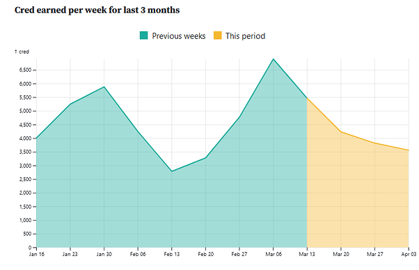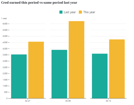 In the last few weeks, from March 1 to March 19, a total of 15,491 Cred have been generated with 131 topics and 1,275 publications created. As we can see in the two graphs below, the activity of these first weeks of March has been particularly intense. In the first graph we see how, after stabilizing in February, activity reaches its peak in early March, even higher than that observed during January after the December holidays. The second graph shows how the Cred accumulated in the period has been considerably higher than that accumulated in the same period last year.