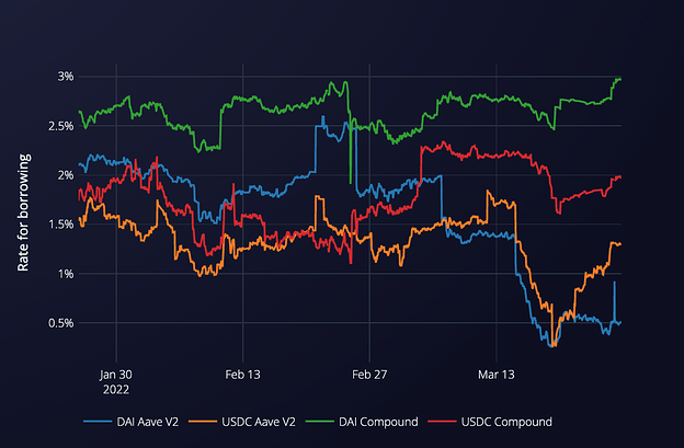 - Negative competitive rates are mostly due to liquidity mining rewards on Compound and Aave, as well as interest and rewards earned on deposited collateral